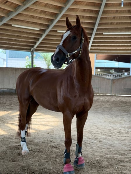 Solo en las mejores manos. Zazu es un caballo castrado de 2017, de pelaje alazán, que posee tanto un corazón de león como de ratón. Zazu es un caballo para jinetes ambiciosos, que cabalga con seguridad y confianza. En la pista aún puede lograr mucho y ya muestra indicios de su buena herencia. Además, disfruta mucho de los pequeños saltos, aunque aún no ha sido entrenado específicamente en ello. Su pata trasera derecha presenta una ligera imperfección estética (sobrehombro), que no causa problemas. → ¡Cualquier información adicional con gusto en contacto privado! ¡Solo entregamos a jinetes responsables y experimentados!