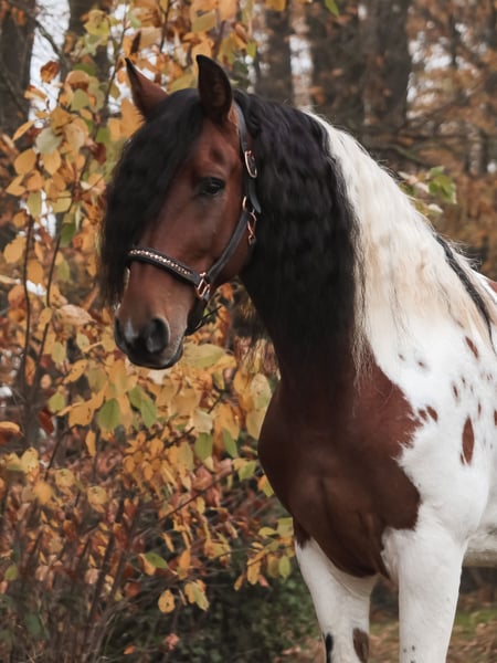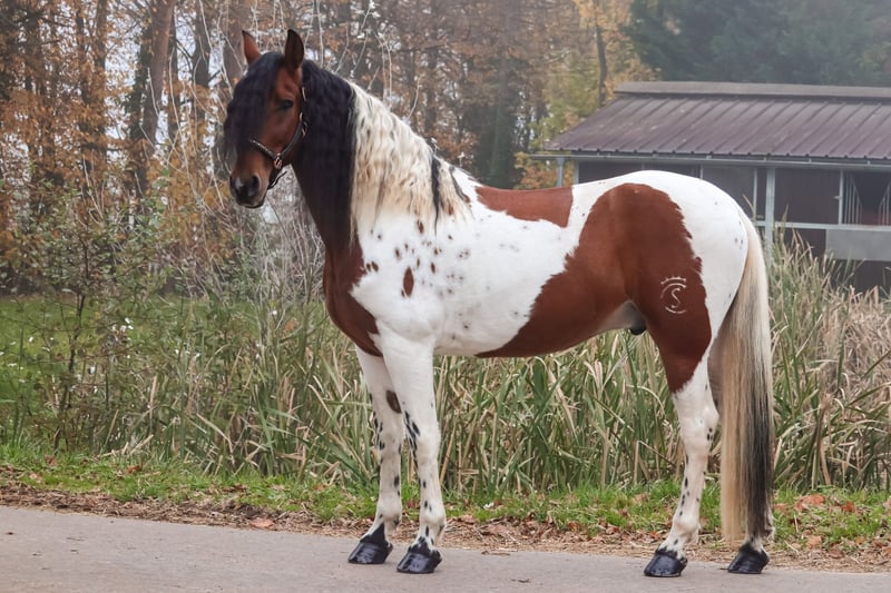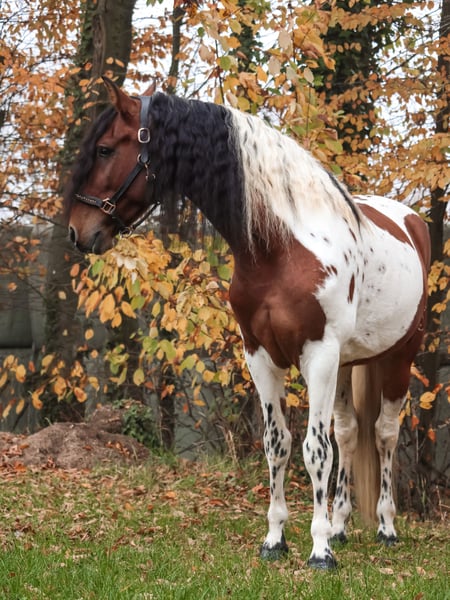 For Sale: Baroque Pinto Gelding – A Unique Horse for Enthusiasts This gelding has a strong character, a friendly demeanor, and is ideal for riders seeking a horse with charm and personality. He is confident in the terrain, stands well for the farrier and loading, and has been fully shod four times. He is vaccinated and dewormed. If you are interested or would like more information, please feel free to contact me. This exceptional horse is looking for a new owner who will appreciate his special qualities! He is absolutely confident in lateral work such as lying down, compliment, and Spanish walk.