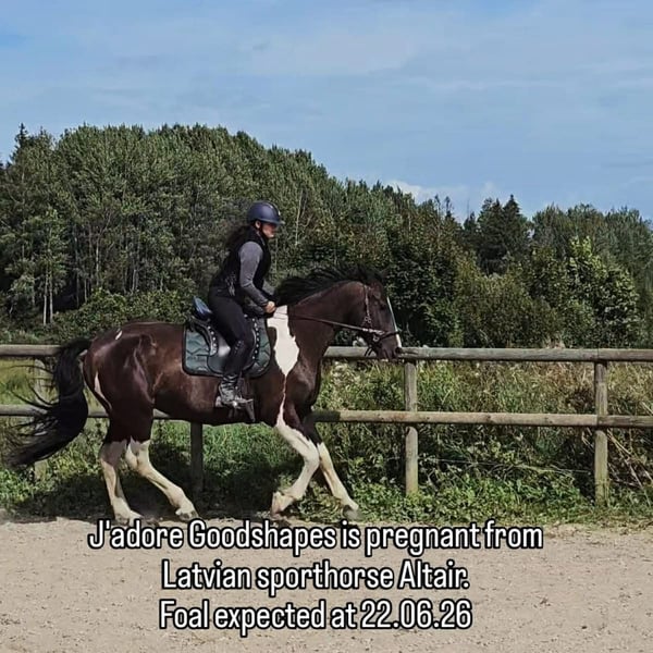 She is big, beautiful and gentle mare. I started her myself in riding- lots of groundwork according to Academic Art of Riding, horsemanship and liberty, I did riding in really slow and gentle so the spine can develop and fuse properly. She is super gentle, I have ridden her a lot in the forest, alone and with other horses. I have used her in kids lessons, she has really impressive canter and trot , she has also jumped with kids a bit. She can do some liberty and is people oriented. She can do in groundwork quarters in, shoulder in, halfpass. No biting, kicking bad behaviour. Trailerloads and travels like a pro alone and in company. Can be alone in box or separate paddock, she does not cry after other horses, not herdbound. She is a leadingmare in my herd. She has had 3 foals, all have been healthy, easy delivery (I have a birth monitor, so I have been there all the times). She is pregnant at the moment from Latvian dressage stallion Altair (from Aromats) Due date is 22.06.2026 She has lived outside with shelter possibility all year round. Regulary trimmed, dewormed, vaccinated, loved and cuddled. Her ears are a bit sensitive- when bridling, you need to be careful not to ´pull´ her ears. She preferres riding in cavesson/ bitless. She wears a bit, but as I see she loves bitless more, I/ and my students have ridden her in cavesson as I don't need a bit myself. She is not officially measured, we measured her at home without correct measuring stick. Her both parents are free of dwarf and hydrocephalus. You can find more pics/videos from our Instagram page barockpinto_estonia Her first foal Nikita https://www.instagram.com/p/C1TvfnOts1p/ Her second foal Oscar https://www.instagram.com/p/DCXYwhUt2Me/ Her third foal Lily https://www.instagram.com/p/DKrD1p7MfEG/ For her foals, she heritages beautiful high neck and strong body. Her halfbrother is licensed breedingstallion LOMME Reasone for selling: I keep her brother (Northern Light from my Instagram account) as my breedingstallion and I cant breed them togeather, so I cant keep her in my breedingprogramme. Real pearl for someone who values slow and groundwork oriented training. She is ready to become your dressage superstar or to bring you many fancy foals.
