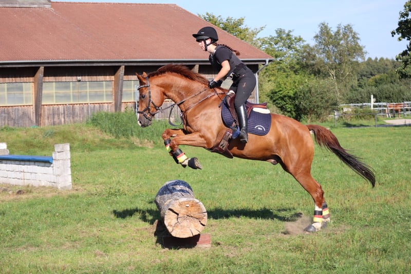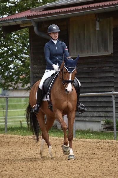 Sunny is a handsome, lively gelding, trained in dressage up to level L/M (shoulder-in, leg-yield, and extended trot work are well-established, and early pirouette attempts are visible) and jumping up to level L. He enjoys working and needs an empathetic and consistent rider and friend who is willing to spend time with him and invest in his training. Unfortunately, I currently lack the time for this, as I am under exam stress and plan to study afterward, which means I wouldn’t be able to give him the attention he deserves. He is very social and non-dominant around other horses, able to share a paddock comfortably with mares or geldings and enjoys social contact. He has been regularly exercised in different environments (arena, indoor hall, and outdoor terrain). Until a month ago, he had to pause his training due to an injury sustained six months ago, but the veterinarian confirmed full healing of the tendon at the end of January. Currently, he is in a rebuilding phase, walking 1 to 1.5 hours daily and gradually increasing work intensity. Throughout this period, a thorough therapy was carried out. Sunny’s training should still be built up over approximately another month to reach normal work levels. The higher his training level, the higher the price…! He is naturally well-behaved when farrier work is done, loading is no problem, and he has competed in numerous competitions and attended clinics. Vaccinations and deworming have been kept up to date. Unfortunately, he is currently not available for trial jumping.