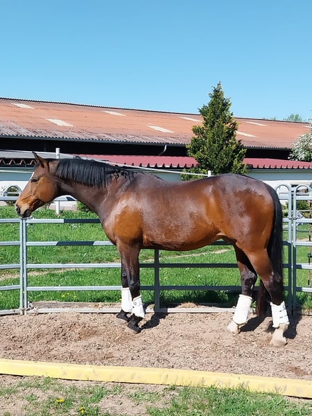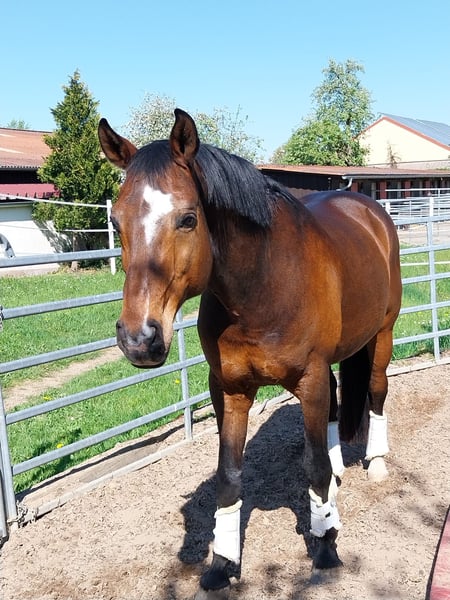 16jähriger selbstgezogener Bay. Wallach von Bellissimo. Wegen Aufgabe des Reitsports, in beste Hände abzugeben. Bellini ist bis L-Dressur gegangen und A-Dressur gewonnen. Aufgrund von bestehenden Problemen im Halsbereich (Arthrose) ist er schon mehrere Jahre kein Turnier mehr gegangen, kann aber mit lockerer Anlehnung in allen drei Grundgangarten geritten werden. Er mag gemütliche Schritt Runden im Gelände, geht gerne an der Longe und auch auf die Koppel. Kontakt nur per WhatsApp