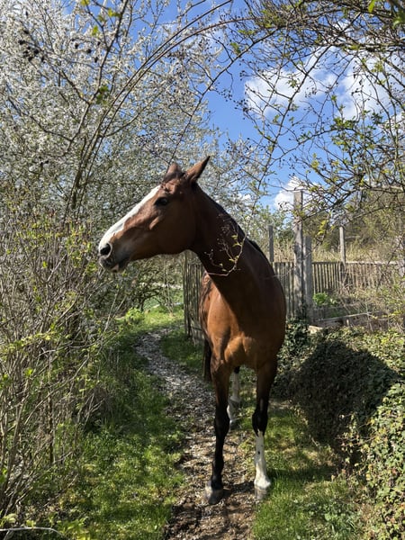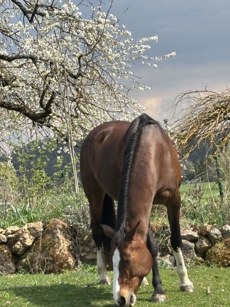 Leider muss ich aus persönlichen Gründen meine sehr menschenbezogene und sensible bayerische Warmblutstute abgeben und suche somit einen schönen Platz, mit täglichem Auslauf und Koppelgang. Lascaraa kommt ursprünglich aus dem Springsport, ihre Abstammung ist auch springbetont. Seit Lascaraa in meinem Besitz ist sind wir viel alleine im Gelände geritten, hierbei zeigt sie sich auch mal energisch und temperamentvoll, für einen stärkeren Reiter aber händelbar. Mit anderen Pferden ist sie gelassener, jedoch kein Anfängerpferd. Dressurmässig kennt sie Lektionen der Klasse L-M. Bei mir steht Lascaraa im Offenstall, kennt aber auch Box und ist herdenverträglich. Erstkontakt ausschließlich per WhatsApp