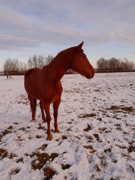 Hello, I am selling my beautiful, well-behaved chestnut mare if the chemistry between horse and rider is right. I can easily see her as a family horse; she is well-suited for a father-son or mother-daughter team. She rides well alone and in groups in the terrain, enjoys leading reliably, and is barefoot with excellent hooves. She makes a good companion horse for young horses, as she is not easily influenced by their exuberance. She is suitable for carrying a lead rope horse. After a brisk canter, she calmly returns to a walk on a long rein. In the arena, she can shine under an advanced rider, and under beginners, she happily trots her circles. An 8-year-old girl is riding her in the video. Complete with a Kieffer dressage saddle, a Kieffer all-round saddle, and blankets included. She thrives on a hay-free diet.