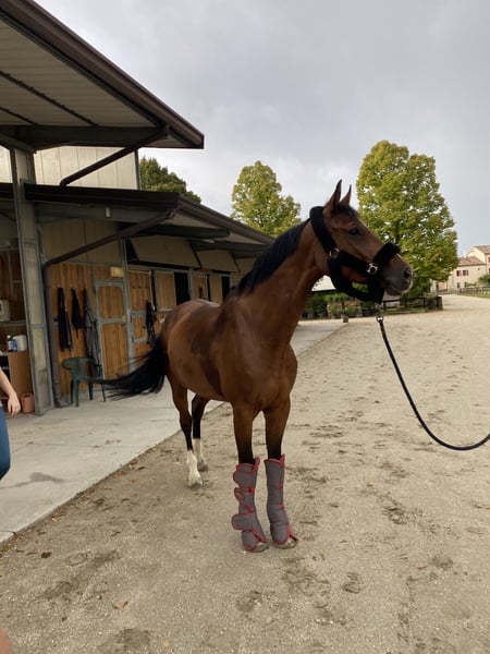 Hilde ist eine 9-jährige ca 170 cm Stute von Diarado x Argentinuns Diese Stute ist optisch einfach ein wahrer Hingucker. Auch beim Reiten ist sie ein absoluter Traum und macht jeden Tag aufs Neue richtig Spaß. Sie bringt von Haus aus ein gutes Go mit, lässt sich aber super zurücknehmen und versammeln. Sie reagiert auf feine Hilfen und ist leicht in der Anlehnung. Dennoch ist Hilde ein eher dominantes Pferd, das arbeiten möchte und ein gewisses reiterliches Geschick fordert. Sie macht einen guten Sprung, wurde aber noch nicht sehr weit gefördert. Die Stute hatte bereits zwei gute Fohlen, weshalb sie auch für die Zucht interessant ist. Sie ist brav von Kindern und Jundendlichen zu reiten. Sie geht ohne Probleme auf den Hänger und ist auch auswärts super unkompliziert. Auch beim Schmied ist sie brav. Wer also ein braves, qualitsvolles Pferd mit Perspektive sucht, das jeden Tag aufs Neue einfach Spaß bereitet, der ist bei Hilde richtig. Pferd steht in Italien