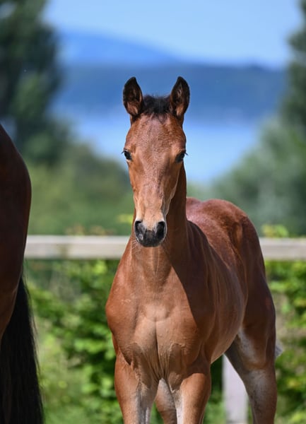 Dorian G is the first foal out of a highly decorated dam. Emilia du Rouet is named after her sire Balou du Rouet and her dam Emilia. The sire is one of the world's best sires in show jumping and eventing, the dam was a state premium mare and southern German vice-champion of six-year-old eventing horses. She qualified for the Bundeschampionat and achieved around 130 placings with an older amateur in show jumping (up to medium**), eventing and dressage (up to elementary class). Emilia du Rouet is very similar to her dam in terms of conformation and interior. She is friendly and uncomplicated to handle, courageous and self-confident, ambitious but always controllable. She passed a good mare performance test and was awarded first prize at the 2023 Bavarian State Mare Show. As she is the only daughter of her dam Emilia, we initially took her into breeding to continue this performance line. She produced a gold-winning colt by Dinken in 2024. At the foal show in Ising, Dorian G received a 9 for all three gaits and a high overall score of 43.5. Dorian G is very handsome, highly elastic and versatile. His character is very much like his dam, he is friendly, people-oriented and courageous. On his first trip to the foal show, he jumped onto the trailer before his mother. From today's perspective, he can undoubtedly be considered a stallion prospect. As we are reducing our breeding program due to his age and his dam is again in foal to Dinken, he is for sale - only to the very best hands.