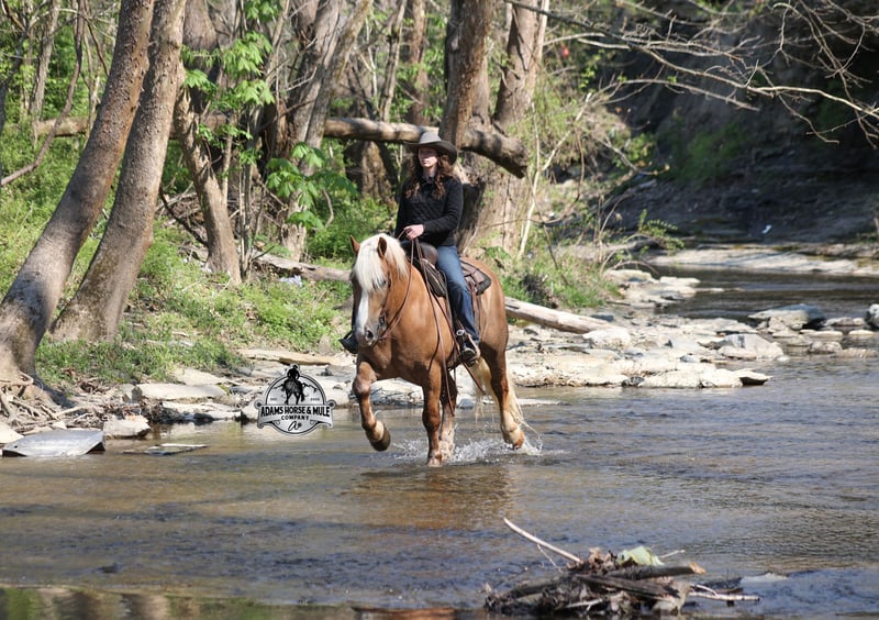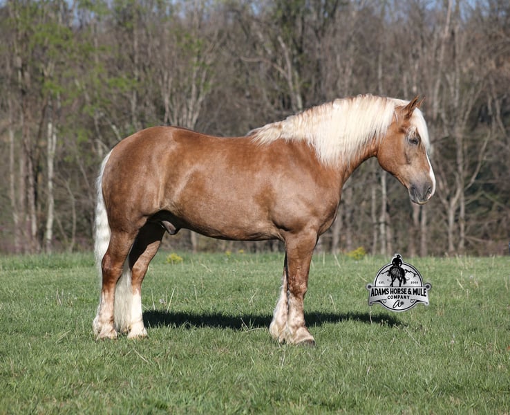 Go to visit our website for more pics and video link at www.AdamsHorseAndMuleCo.com AHAMC has been in the horse business and sold horses over the internet since 2005. We have a long track record of success with hundreds of happy customers. We work hard to match riders with the correct horses and specialize in beginner safe, family friendly horses that have been used and checked out by our family! We can set up transportation anywhere in the US and look forward to working with you. If your confidence levels are low and you have had nothing but bad luck with you other horses… just say goodbye to those days because your new Buddy is here! Buddy is a beautiful Golden Palomino/Blonde Sorrel Gelding that is very stocky built, he is 6 years old, is standing 15.2hh and he is a looker! He is a draftcross horse that has completed the natural horsemanship program, is very friendly and loves attention!! He knows some tricks as well as he will lay down on command. Buddy has done it all from being ridden by small children down the highways to being ridden around the ranch, checked cows, rode fences and cruised the trails. He has been used at brandings and drug calves to the fire. He is a laid back type of guy that will just plod along down the trails with no hesitation and not in a hurry. He has been on camping trips and has been ridden by all ages of riders from 6 to 86 that guy will be safe and easy to ride. When out on the ranch or going down the trails he will cross creeks, ditches, logs and navigate rough, rocky areas. He is safe in traffic whether that be trucks or cars. He walks on a loose rein, has a nice jog, his lope is slow and collected plus he lopes very nice circles on a loose/draped rein! Buddy is a great horse for the whole family! He has been exposed to all kinds of wildlife such as deer or turkey. He is athletic and does great under English tack and goes over the rails with ease. He is harness broke for all farm machinery and buggies. Buddy is one that the whole family will love, he will be perfect for the guest to ride as he will build his riders confidence, with a personality that will make him everyone’s best friend! Feel free to call Eric 606-308-2461 with any questions!