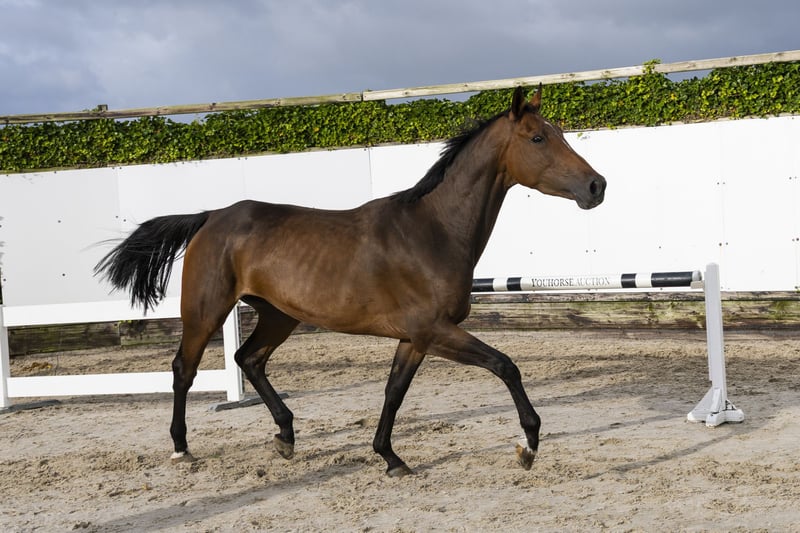 The four-year-old Verena Van Het Schaeck is an interesting mare for sport and breeding. She already produced a foal this year, which was weaned two weeks before the video day. Verena is large-framed and ready to start her training, though still a little green in handling. Sire Rockybo Van Het Schaeck is an eight-year-old son of Diamant de Semilly out of the 1.60m Grand Prix mare Exquis Walnut de Muze. This line also appears on the dam’s side. Dam Quantro Van Het Schaeck (Plot Blue) is the full sister of the 1.60m GP stallion Million Dollar. They are bred out of Gin Tonic de Muze (Vigo d’Arsouilles), daughter of the 1.60m GP mare Daytona de Muze (Cento) and half-sister to six (inter)national showjumping horses at 1.30–1.50m level.