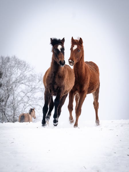 Notre petit roi cherche son partenaire deux-pieds créatif et passionné pour la vie ! Ce magnifique fils d’Ittu et de Haalim al Canton impressionne par son esprit vif et sa force intérieure. Sa mère, plutôt de rang élevé, lui transmet une confiance en lui particulière – il est rare de le voir inquiet ou craintif. Déjà avant son sevrage, il se distingue par son autonomie et sa grande compétence sociale. Cette particularité nécessite pour un futur foyer un propriétaire réfléchi et clair, ainsi qu’une bonne organisation du troupeau ! Certainement, Juba deviendra un cheval de rêve entre de bonnes mains – peut-être aussi pour un jeune cavalier sous une guidance et une supervision appropriées. Cependant, son intérieur typiquement berbère représente aussi un défi. Nous souhaitons donc pour cet élégant mais solide étalon un foyer stable avec de bonnes options d’élevage – si besoin, Juba peut également être intégré dans un élevage d’étalons existant près de la frontière germano-belge. Un cavalier actif et sportif trouvera en Juba un cheval qui a peu de limites physiques. Toutefois, son tempérament lui confère également un rythme soutenu et une joie de mouvement, caractéristiques plus typiques des chevaux ibériques. À l’avenir, il devrait être emmené dans des défis et des tâches avant même le débourrage, afin qu’il puisse suffisamment mûrir et grandir physiquement tout en développant son appétit pour la nouveauté. Il apparaît que ces lignées sont mentalement plus précoces et qu’elles rattrapent leur retard sur le plan physique. Nous recherchons moins un connaisseur absolu de la race qu’un cavalier engagé et passionné, qui voit la dynamique et l’intelligence comme un cadeau, et qui dispose de suffisamment de temps pour un futur partenaire à hauteur d’homme.