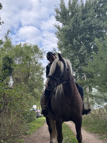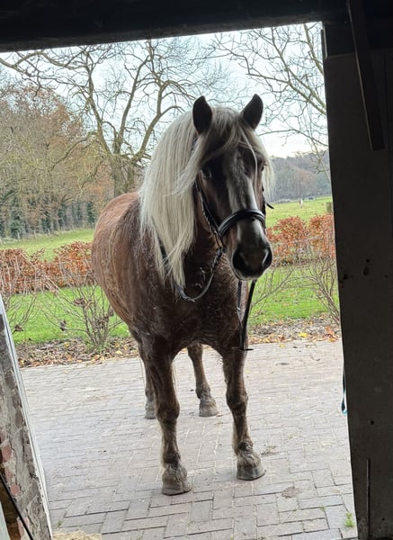 Onze mega lieve allrounder zoekt een nieuw huisje Macho word gereden door beginners en onervaren ruiters maar gaat ook met ervaren ruiters graag op buitenrit. Macho kan ook een rondje in de bak en een klein sprongetje maar word hier vooral recreatief ingezet. Macho is rustig in de weide en knuffelt borstelt graag, wandelt ook wel vaker en staat met zadelen meestal gewoon los op de plaats.