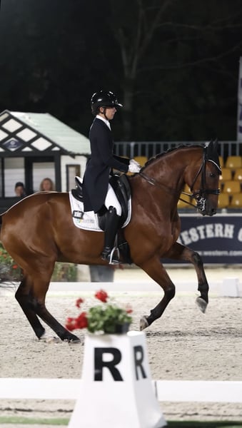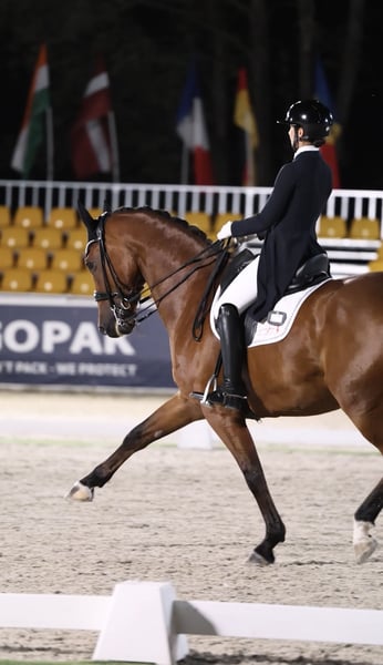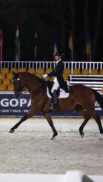 Carácter y talento excepcionales, un caballo FEI que sería ideal para un jinete junior, joven o amateur que busca un caballo talentoso para lograr éxitos en la disciplina de doma clásica. Recientemente obtuvo un 66 % y quedó en 5ª posición en el CDI de Ornago, está listo para la arena de competición. Disfruta de paseos en el campo, funciona perfectamente en concursos tanto en pista cubierta como al aire libre, y es muy fácil y dulce de tener en el establo. Es progresivo, por lo que sería adecuado para un jinete seguro de sí mismo que quiera triunfar. Buena revisión veterinaria.