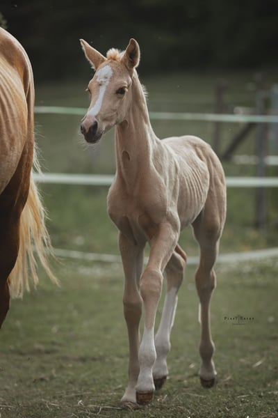 Stylish filly in the desirable palomino color, equipped with excellent movement! She is an outstanding offer for the dressage arena and, with her versatile pedigree, also interesting for eventing! Sire "Alle Farben" was a premium stallion in Neumünster, HLP winner with excellent scores, and has won 3-year-old riding horse classes as well as being the Hessian champion of 3-year-old Trakehners. The dam, Bon Courage, shines in dressage with S-level victories and outstanding offspring. The mother completed the mare performance test at 4 years old with an overall score of 7.52, with jumping also rated at 7.5! A descendant of the mother has been licensed and has been successful in eventing training classes. A raising place with the best conditions would be available if interested.