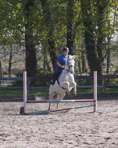 Red Bull jument de 18ans toisant 1m40. A fait du club, bien mise sur le plat agréable et intéressante mais avec son petit caractère, ne convient pas à un débutant. Enchaine un petit parcours de 50/60cm sans problème. Aucun souci de santé, à jour vaccins, vermifuges, maréchal (vit pied nu) et dentiste.