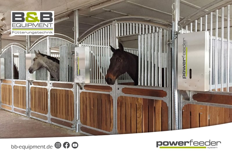 Guten Tag, Das powerfeeder-System ist der automatische zeitgesteuerte Kraftfutterautomat vom Fohlen- bis Seniorfutter. Für mehr Gesundheit und Wohlbefinden für Ihr Pferd. Für Sie mehr Zeit mit Ihrem Pferd. 24/7 wird Ihr Pferd mit unserem powerfeeder-System versorgt. Das powerfeeder-System verfügt über unterschiedliche Modelle und kann von Pellet, Hafer, Gerste bis hin zum Seniorfutter mit viel Struktur und Melasse. Durch viele kleine gesunde Portionen wird Ihr Pferd das Kraftfutter besser verwerten können, zudem ist es magenschonender. Der powerfeeder ist aus Edelstahl und 100% nachrieselfrei und lässt sich spielend leicht programmieren. Betrieben werden kann der powerfeeder im Netzstrom, Akku oder AkkuSolar. Gerne sind wir Ihr Ansprechpartner für die zeitgesteuerte Fütterung Ihrer Pferde. Auch für Sonderanfertigungen, mit denen Spezialfutter wie Luzerne, faserige Futtersorten oder pulverartige Mineralfuttersorten zugeteilt werden sollen, haben wir die passende Lösung und eigens entwickelte Spezialfuttersysteme parat. In unserem Sortiment haben wir verschiedene Kraftfutterautomaten für verschiedene Futtersorten sowie die Option mit Bewässerung. Sprechen Sie uns an! Für Beratung und alle Fragen rund um unsere Futterautomaten und den zu realisierenden Möglichkeiten stehen wir Ihnen natürlich jederzeit gerne zur Verfügung. Wir freuen uns auf Ihre Nachrichten! B&B equipment GmbH Made in Germany
