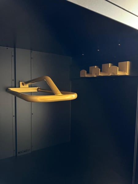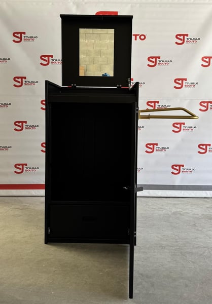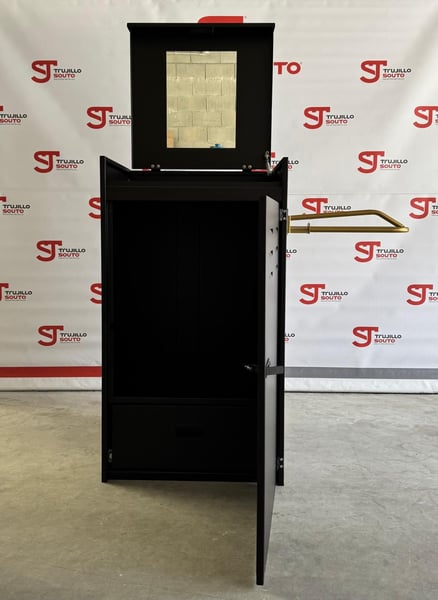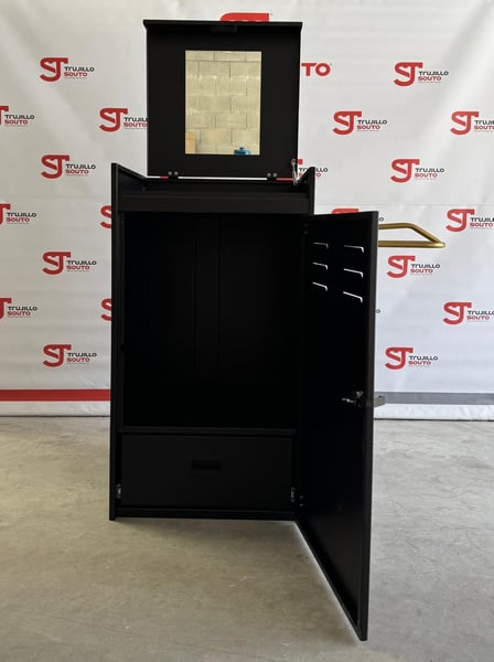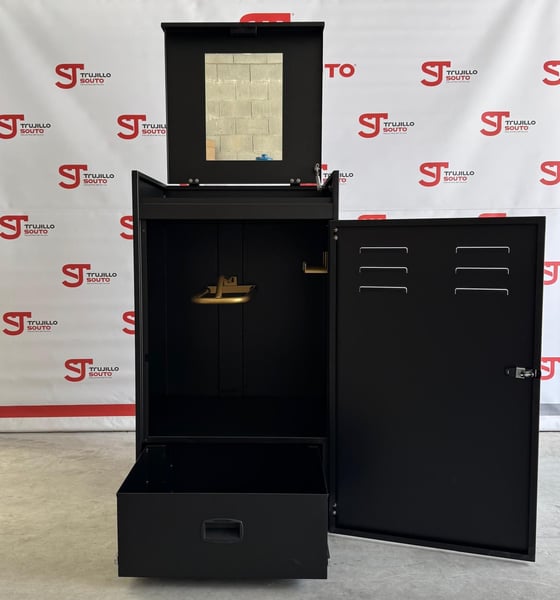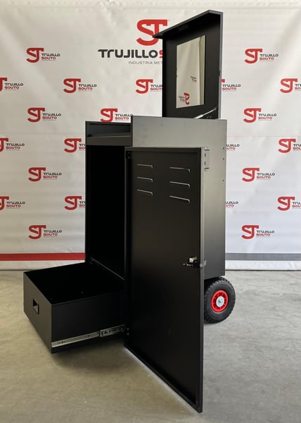 SADDLE BOX Competition box for saddles and bridles, with upper and lower compartments equipped with a mirror. Dimensions 0.60x0.65x1.2m. With ergonomic handle and wheels to facilitate movement during competitions. The saddle and bridle hanger can be placed on the outside of the box to facilitate the cleaning of equipment and the preparation of the horse.