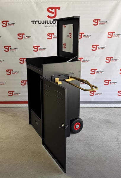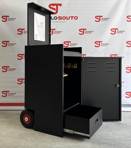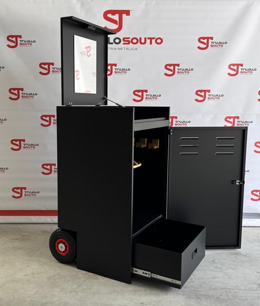 BAÚL GUADARNÉS Wedstrijdkist, voor zadels, hoofdstel, met een boven- en onderlade voorzien van een spiegel. Afmetingen 0,60x0,65x1,2m. Met ergonomische handgreep en wielen voor gemakkelijk transport tijdens wedstrijden. De hanger voor zadels en hoofdstellen kan aan de buitenkant van de kist worden bevestigd om het schoonmaken van het materiaal en de voorbereiding van het paard te vergemakkelijken.