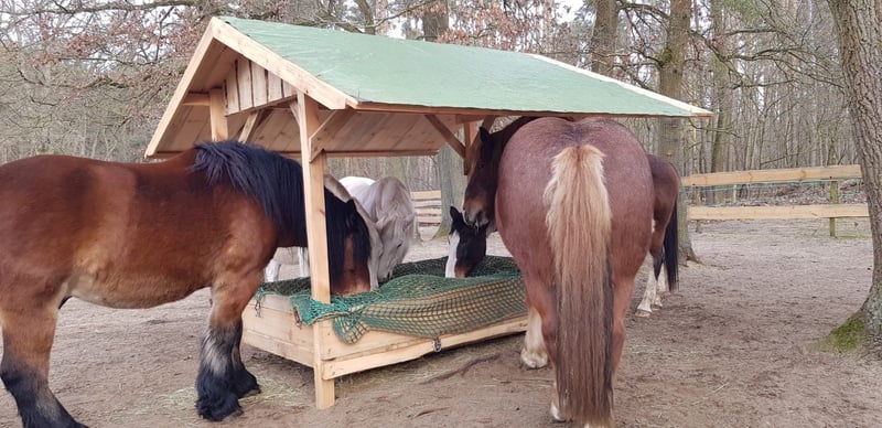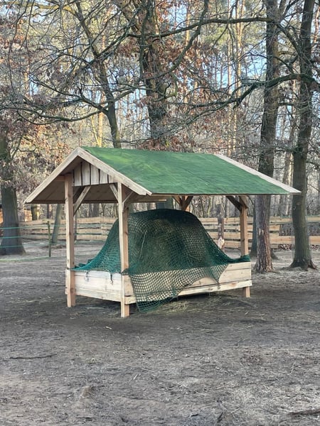 Wir bieten hier unsere selbst hergestellte Heuraufe aus Holz für 6 bis 8 Pferde an. Die Raufe wird nagelneu und unbenutzt verkauft und kann in 2 Teilen auseinandergebaut abgeholt werden. Unser Hof liegt im Jerichower Land/Sachsen-Anhalt (Schlagenthin). Ein entsprechender Versand ist mit Übernahme der Versandkosten durch den Käufer möglich. 1,65 m breit, 2,7 m lang, 2,5 m hoch, Dachüberstand 0,90 m, Dachplatte 1,90 mx 3,20 m