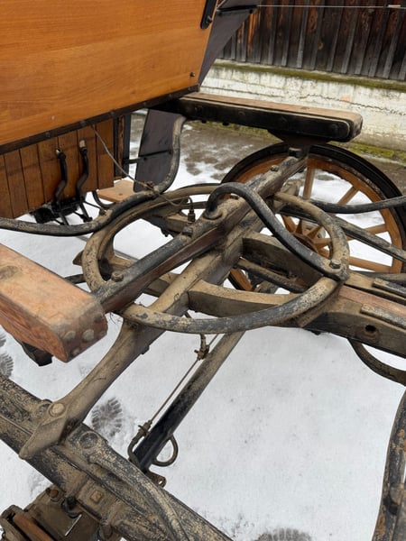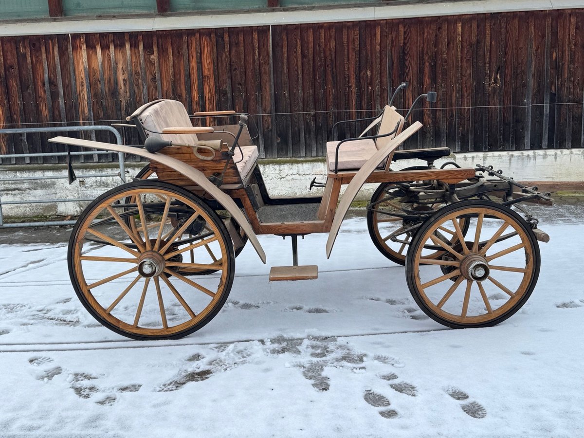 Gerestaureerde zelfrijder, nieuwe houten wielen met rubberen banden, diameter achter 120 cm, voor 70 cm, schijfremmen. Niet in originele staat omdat de rempedalen links zijn geplaatst om beter te kunnen rijden in rechtsverkeer. Houten blokrem rechts bediend. De koets verkeert in zeer goede, rijklare staat. Neem alstublieft alleen contact op via telefoon 0160 94 61 35 68 of e-mail: sylviamorgenstern@gmx.de