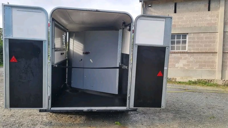 Rot-proof polyethylene floor Door with front gate 3 sliding bays Front tack room with tack height extension Wireless surveillance camera Summer opening External spare wheel Reverse mirror for towing Unladen weight: 780 kg Gross vehicle weight: 2,400 kg