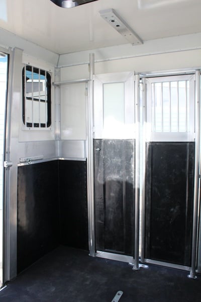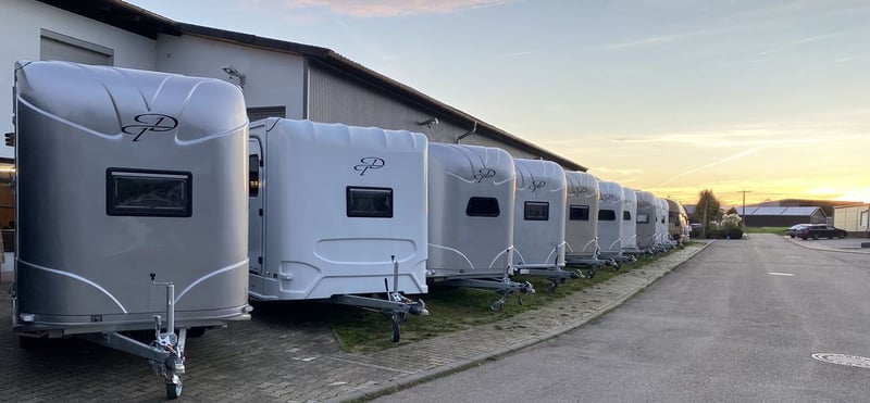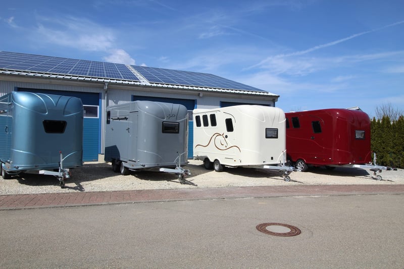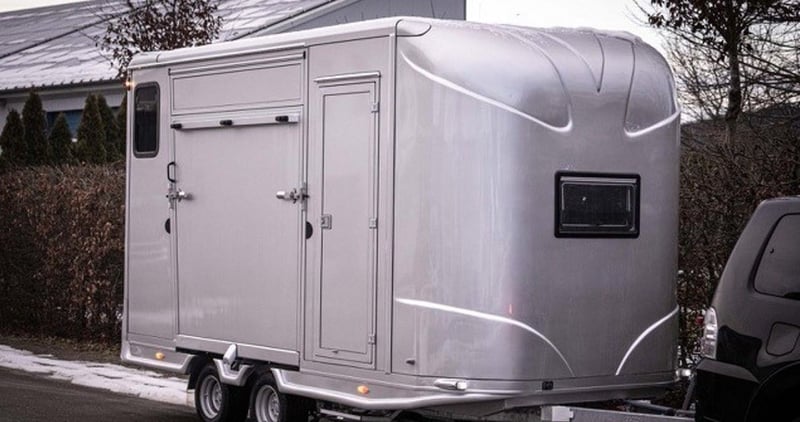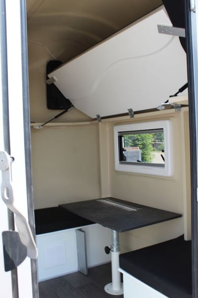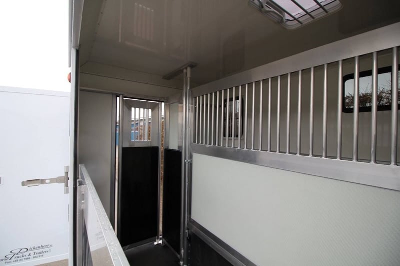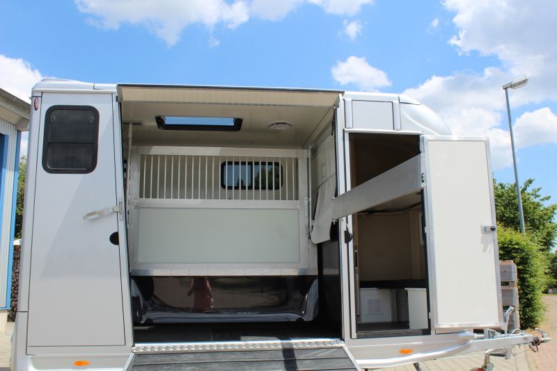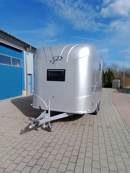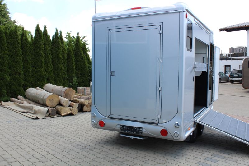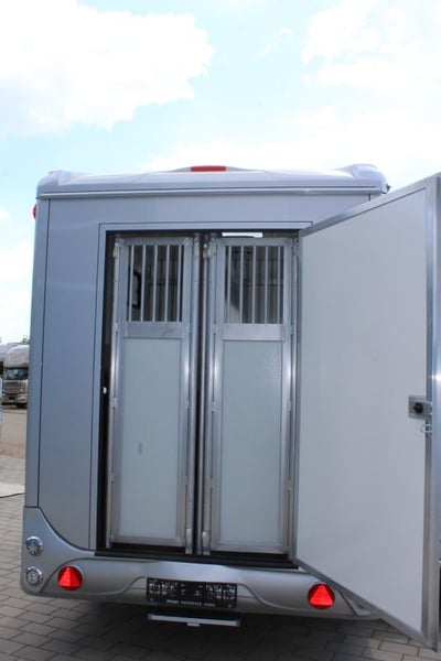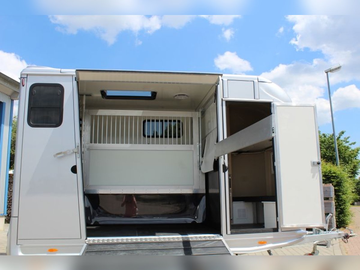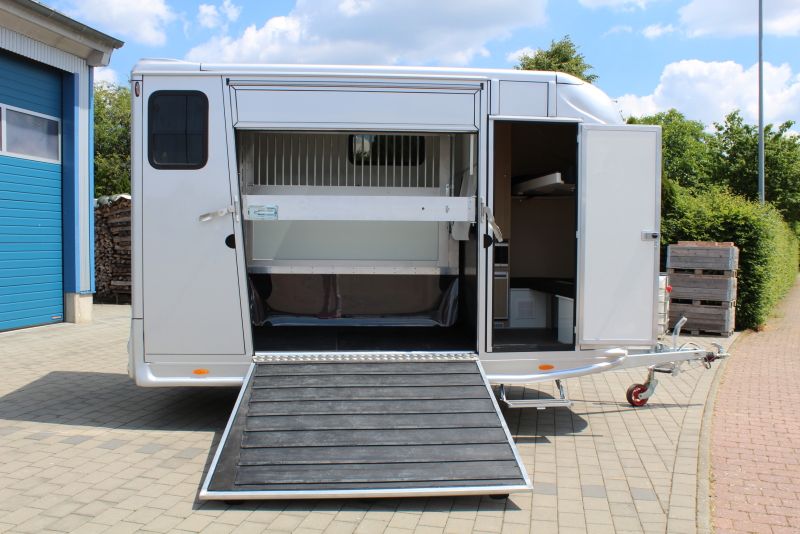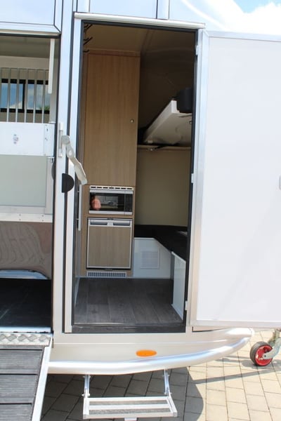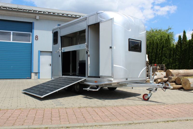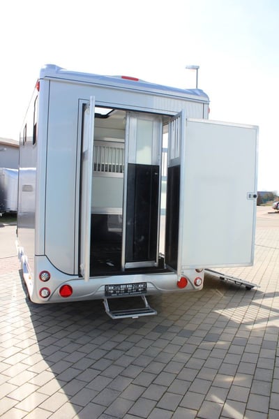 New 2-horse trailer with stallion equipment and small living compartment Our trailer for transporting 2 horses for driving license class 3, or as an additional trailer to your vehicle Equipment of the new aerodynamic 2-horse trailer with side loading and small living compartment: The horses are transported standing backwards and have significantly more grip when braking. The large side ramp makes it much easier to load most horses. Small Living Equipment: 2 parking spaces and small living compartment Permissible total weight 2700 kg; Floor assembly made of aluminum Snaplock profiles bonded with special rubber floor mat; 30 mm thick full poly side and roof panels, aerodynamic front design Side ramp made of aluminum profiles with rubber step protection, ventilation flap above; Plank on the ramp Side door with folding, easy-to-operate steps; Small recreation cabin at the front 2 side windows on the left and one side window on the right one roof hatch; Small living compartment: 2 seats with lowerable table convertible into a bunk bed Closet with refrigerator and microwave Front hinged window TÜV papers; Optional extras at extra cost Side bolsters Radio video camera 220 volt external connection Aluminum tread strips on the ramp Air conditioning system Awning TV satellite system Power supply through PV system Viewing only possible by appointment We always have 2 or 3 horse trailers with living compartment or tack room in stock and immediately available Inquiries under 01606106131----00491606106131