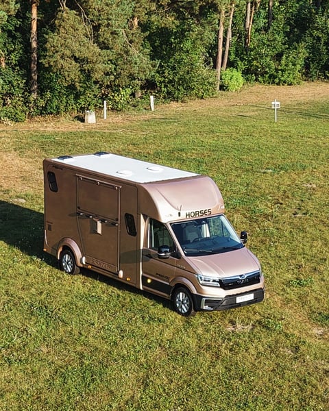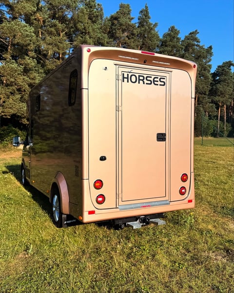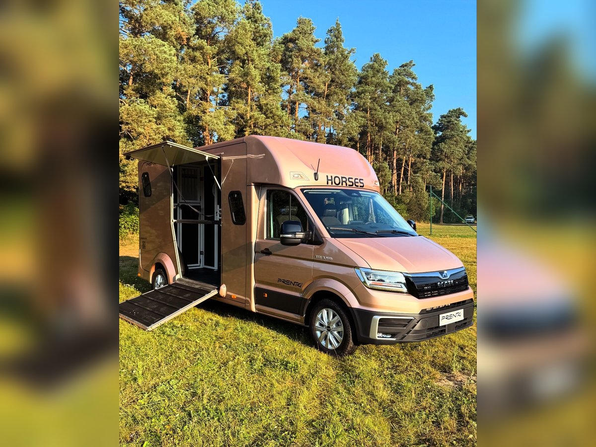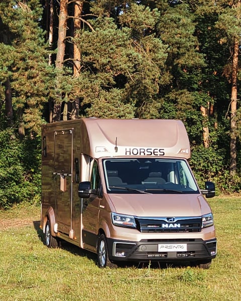 Horsebox MAN/Prentki TGE – Available for Immediate Delivery As a manufacturer of specialized horse transport bodies, we present a ready-to-deliver horsebox built on a MAN TGE chassis 2025. The vehicle has been designed with a focus on safety, horse comfort, and driver and passenger convenience. Warranty: - 36 months on the bodywork – unlimited mileage ✔ - 24 months on the chassis (MAN) ✔ Technical Data: - Year of manufacture: 2025 - Number of seats: 5 (extended cab) - Engine: 2.0L EU6 SCR, 163 HP (120 kW) - Transmission: 8-speed automatic (AQ) - Drive: front-wheel drive - Gross permissible weight: 3,500 kg (driving license category B) Cabin Equipment: - Climatic air conditioning - Cruise control and intelligent speed limiter - Lane keeping assist, autonomous emergency braking, traffic sign recognition - LED main headlights with daytime running lights, fog lights with cornering function - Light Assist high beam assistant - Leather, heated multifunction steering wheel with Tiptronic - MAN Media Van Business Navigation multimedia system with 12.9" screen and smartphone integration (wireless charging) - Driver and passenger airbags, Start-Stop system, ESP, ABS, hill-start assist - All-season tires, electrically adjustable and heated mirrors Horse Area: - Insulated walls and ceiling with 30 mm panels - Aluminum floor covered with anti-slip rubber - Aluminum entry ramp with ribbed rubber and lift-up flap - Two-position partition wall and fixed breast wall - Interior lined with rubber up to 1,000 mm height and protective padding - Two roof vents and two 12V fans - Interior lighting and an additional rear work lamp - Side and front windows providing ventilation and natural light - Monitoring: interior camera and reversing camera - Tow hitch, rear step, ramp hinge cover, rigid ramp safety devices Body Color: Pale Copper Metallic Vehicle available immediately – no waiting period PRENTKI Multi-Industry Company is currently an authorized manufacturer of bodies for brands including Renault, MAN, Mercedes, Fiat, among others, producing medical ambulances, campers, courier vehicles, and retail vehicles. The company’s main and most dynamic sector is the production of new horseboxes. Having built over 1,000 such vehicles, PRENTKI continues to strengthen its position on the Polish market and abroad. Customers choosing PRENTKI vehicles benefit from well-designed constructions and solutions backed by many years of experience. We place utmost emphasis on safety and functionality. All materials used in the production of our bodies are certified, and the structural solutions undergo testing, as confirmed by EU type approval. On March 1, 2019, our company received the ISO 9001:2015 certification, confirming compliance with quality management standards. In 2003, PRENTKI obtained the PN-EN ISO 9001:2001 quality system certificate. Our trading partner in Germany, Dickenherr Trucks & Trailers GmbH, always has vehicles in stock and is happy to assist you!