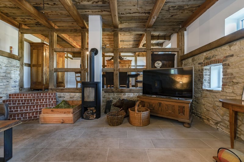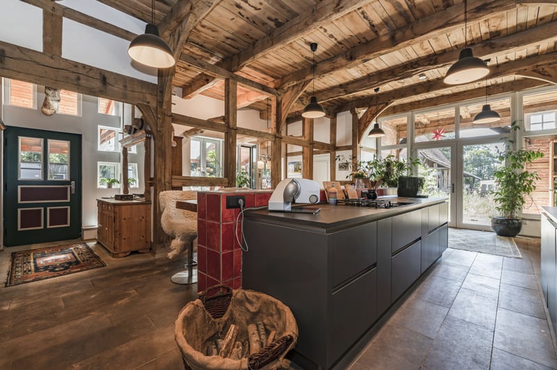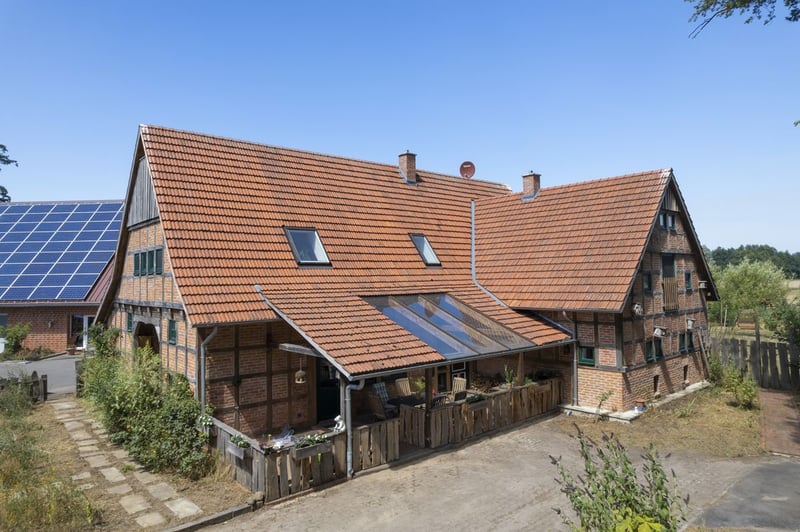 Grundstücksgröße: ca. 48.975 qm Wohnfläche: ca. 335 qm Gewerbliche Nutzfläche: ca. 450 qm Anzahl Zimmer: 8 Baujahr: 2015 neu aufgebaut, neben Gebäuden um 1890 (Scheune), ca. 1950 (Garage, Pferdestall) Stellplätze: 10 Freiplätze Heizungsart: Fußbodenheizung Energieausweis: Energieausweis: bedarfsorientiert // Endenergiebedarf: 19,5 kWh // Energieeffizienzklasse: A+ // wesentlicher Energieträger: Erdwärme Auch eine Aufteilung der Immobilien nebst Grundstücken denkbar. Sollte diese Option für Sie interessant sein, sprechen Sie uns hierzu gern an! Das nach alter Technik, aber auf dem aktuellen Stand bis 2019 neu aufgebaute Fachwerkhaus liegt idyllisch an einem kleinen Wald und ist umgeben von Feldern und Wiesen. Lediglich die Mauern des Ursprungshofes im heutigen Wohnzimmers sind stehen geblieben, der um 1876 erbaut wurde. Über zwei Einfahrten haben Sie die Möglichkeit, auf das Grundstück zu gelangen. Durch eine auf neuestem Stand gebaute Gewerbeeinheit mit Photovoltaik- (Leistung: ca. 29,7 kWh) sowie Solarthermieanlage, einem ehemaligen Rinderstall sowie ein Doppel-Carport und weitere Gebäude wird dieses Ensemble für die Umsetzung von Arbeiten und Leben auf dem Land ergänzt. In dem großzügigem Garten befinden sich ein Teich und diverse Obstbäume. Ausreichend Platz für die große Familie findet sich im Wohnhaus, dass im Zentrum des Hauses (im Deelenbereich) die Küche angesiedelt hat. Von hier aus gelangen Sie in die weiteren Räume wie Esszimmer mit angrenzendem Wohnzimmer, Schlafzimmer, Speisekammer, Hauswirtschaftsraum sowie das Bad oder Gäste-WC. Im Obergeschoss befinden sich weitere Schlafräume, Wohnzimmer mit Anschlüssen für eine Küchenzeile, Badezimmer sowie ein großzügiges Büro. Auch der Spitzboden wurde ausgebaut und bietet so eine gute, weitere Nutzfläche. Das Wohnhaus wurde so aufgebaut, dass der Bereich im Obergeschoss mit wenigen Baumaßnahmen als zweite Wohneinheit mit separatem Zugang genutzt werden könnte. Der Gewebeteil wird aktuell als Wildmetzgerei genutzt und umfasst eine Nutzfläche von ca. 450 qm, inklusive Ladenfläche, Lagerräumen und WC. Eine Umnutzung z. B. in eine Arzt-, Tierarzt- oder Physiotherapiepraxis ist denkbar. Das Dachgeschoss ist gedämmt und bereits teilweise mit Rigips verkleidet. Die Kühlräume sind so angelegt, dass eine Wärmerückgewinnung durch Abwärme der Kühlkammern stattfindet. Auch eine Oldtimer-Sammlung würde auf diesem Areal ausreichend Platz finden. Ebenso könnten weitere Wünsche erfüllt werden -wie zum Beispiel ein Freisitz nahe dem Reitplatz mit Blick in die Weite der Natur böte sich geradezu perfekt als Sommerküche an. Die bereits gedämmte und geflieste Garage könnte aufgrund der Anschlüsse zur Sauna umgebaut werden oder aus dem ehemaligen Rinderstall wird ein Café mit Ladenbereich ... . Auf den umliegenden Flächen (ca. 35.920 qm Landwirtschaft/Grünland sowie ca. 6.670 m?? Wald/Grünfläche) finden sich: l Offenstall mit Paddock und angrenzender Weide l Reitplatz (ca. 25 x 50 m) l weitere Gebäude (u.a. Schuppen, Carport) l kleiner Wald mit altem Baumbestand l Weidefläche, arrondiert Das Herzstück des einladendes Wohnhauses stellt die offene Küche dar, die als Bonbon mit einem Grundofen ausgestattet ist, der für eine wohlige Wärme sorgt und die im Erdgeschoss befindliche Fußbodenheizung sehr gut ergänzt. So wird das Haus bei Betrieb auch über Nacht in einer angenehmen Temperatur gehalten. Ein Backfach zum Warmhalten von Speisen rundet den Grundofen ab. Im Erdgeschoss sorgt das offene Gefache für eine gemütliche Atmosphäre, wobei im Obergeschoss die Wände glatt gespachtelt hell und modern sind, jedoch den ländlichen Charme durch die Vollholz-Lärchedielen sowie -balken beibehalten. Im Erdgeschoss hingegen besteht die Decke sowie das Gebälk aus Eiche. Die Küche ist ausgestattet mit Geräten von NEFF (Kombigerät: Dampfgarer und Ofen) sowie jeweils zwei Kühlschränken, Induktionsplatten und Gaskochfeldern. In dem ursprünglich gedachten Stallbereich liegt der gemütliche Essbereich mit Zugang zur Glas überdachten Ost-Terrasse. Windgeschützt und überdacht lässt sich die Mittagssonne mit Blick zur Hofeinfahrt genießen. Das Esszimmer befindet sich angrenzend zur Küche, von dem aus Sie über die Nord-Terrasse in den großzügigen Garten mit Teich oder über wenige Stufen in das mit Naturstein gemauerte, etwas tieferliegende Wohnzimmer gelangen. Etwas separat liegt das Schlafzimmer zum Norden hin ausgerichtet nahe dem Tageslichtbad mit Dusche und Badewanne. Der gesamten Fußboden im Erdgeschoss ist mit unbehandelten Sandsteinfliesen ausgelegt, ebenso die Wandfliesen in den Badezimmern. Lediglich das Gäste-WC ist mit gemusterten Steinfliesen in dezenter Farbgestaltung ausgestattet. Sonstiges: Dieses Objekt bieten wir in Kooperation mit einem unserer Netzwerk-Makler an. Mit Ihrer Kontaktanfrage akzeptieren Sie, dass Sie sich für dieses Objekt interessieren und ein Expose von unserem Netzwerk-Makler anfragen. Ebenso bestätigen Sie die Provisionsvereinbarungen zwischen unserem Netzwerk-Makler und Ihnen, die im Falle eines notariell bestätigten Kaufvertrages rechtskräftig werden. Ebenso bestätigen Sie, dass wir berechtigt sind, Ihre Kontaktdaten an den Netzwerk-Makler weiterzuleiten.