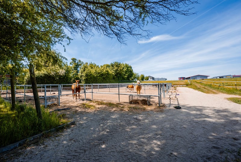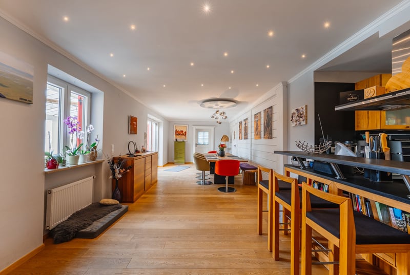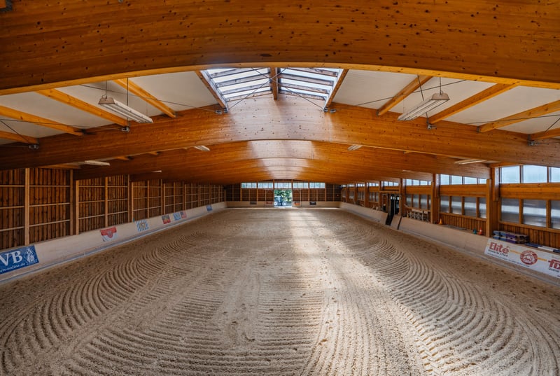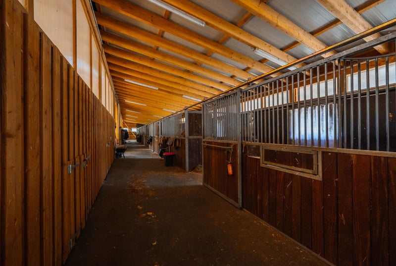 In a tranquil location in Sinzing, this beautiful ranch offers a perfect blend of living and working with horses. With just over 17,000 residents, Sinzing boasts a good infrastructure. Whether it's train connections, supermarkets, doctors, or banks – everything is available and easily accessible. The nearby Danube River is about a 10-minute walk away, inviting relaxing strolls. THE RANCH stands for a lifestyle concept that combines a connection to nature with modern comfort – driven by a passion for horses. A place that harmoniously brings together all these elements: living, working, and personal hobbies merge here into a holistic lifestyle. Directly located at the courtyard, with a view of the facility – yet completely private – is the residential house. Originally built in the 1980s, the house underwent extensive renovations in 2011 and now presents itself as a stylish retreat with rural charm. Approximately 319 m² of living and usable space is spread across two potentially independent units – currently united into a spacious whole. (2 separate entrances available) For those seeking something special: quietly located, close to nature – yet right in the middle of it all. The Residential House The entrance leads into an open kitchen and dining area, flooded with light and generously sized – featuring a large dining table that offers views out to the terrace and pool through the large windows. This is where cooking, laughter, and living happen. A place for family, friends, and special moments. Adjacent to this area is a guest toilet and direct access to the garage – practical for quickly getting groceries into the fridge. From the garage, you can also directly access the laundry room, discreetly and functionally integrated. (Very convenient for a quick entry from the yard into the house – simply through the garage) The living area is the heart of the house: High ceilings, an open roof structure, visible wooden beams, a fireplace for cozy hours – and large skylights that flood the room with daylight. Two terrace accesses open the space to the outside. An elegant country-style staircase leads up to an open gallery, which not only impresses visually but also offers a view – both to the outside and back into the living area. There is also a small bathroom with a shower and toilet on this level. From the gallery, a passage leads to the second unit, which is currently part of the overall space but could be separated and used independently if needed. This level begins with an office, ideal for a home office or administration. The path continues into another kitchen with a dining area, also with access to a balcony overlooking the courtyard – a quiet spot for the first coffee of the morning. A long hallway leads to two bedrooms, one of which has a staircase down to a wash and storage room – versatile for supplies, as a technical room, or as a hobby or guest room. The other branch of the hallway leads to a large bathroom with a shower, bathtub, and toilet – spacious and stylishly designed. At the end of this hallway is another guest room with its own bathroom, including a shower and toilet – perfect for visitors or family members who want their own space. Guest Apartment – Versatile & Independent A special bonus is the small, separately accessible apartment in the house – with its own bathroom (shower/toilet), living/sleeping area, and a compact kitchenette. Perfect for staff, guests, or rental – however you need it. Garage & Outdoor Area The house offers a total of 4 integrated garages, supplemented by 2 additional ones – totaling 6 garage spaces, providing ample room for vehicles, trailers, or equipment. Additionally, the courtyard offers 4 more parking spaces. The Garden Oasis The large terrace invites long summer evenings filled with extensive barbecue delights. The outdoor pool features a practical sliding roof, allowing for year-round use. For those who prefer more heat, there’s a sauna or a bubbling hot tub. A small pool house rounds off the bathing pleasure. The Equestrian Paradise On approximately 2.5 hectares of land, a riding facility unfolds that is second to none – thoughtfully planned, lovingly maintained, ready for new stories. – An indoor riding arena (25 x 50 m) built in 2013, currently set up for Western riding – but easily adaptable for any riding style. – Directly in the riding arena is a riding lounge – perfect for shared moments with fellow riding enthusiasts. From the in-house spectator balcony, it’s possible to enjoy a perfect view of events. For example, Western-style events become a visual delight for owners and guests. – An outdoor riding arena (28.5 x 90 m), large enough for competition ambitions – or simply the perfect daily training space. – Stalls and two open stables for around 30 horses, embedded in generous paddock areas. Three foaling boxes with camera monitoring – ideal for breeders. – Ample parking space (for cars and trailers) is available for boarders and guests. The private area is secured by a barrier system with license plate recognition. – Additional security features: Selected areas, including the riding arena, courtyard, and another box, are under video surveillance. The property also includes open spaces and forest areas in close proximity. The meadows are used for hay production, while the forest provides wood chips for self-sufficient heating – ecological, efficient, and independent. Heating type: Wood pellet heating, oil for hot water preparation, heat pump for the pool (operated via the PV system), and a separate heat pump for the hot water supply for the horse shower. This extraordinary property combines stylish living, a love for horses, and relaxation at the highest level. With its riding facility, pool, and thoughtful architecture, it offers space for living, working, and lifestyle – all in one place.