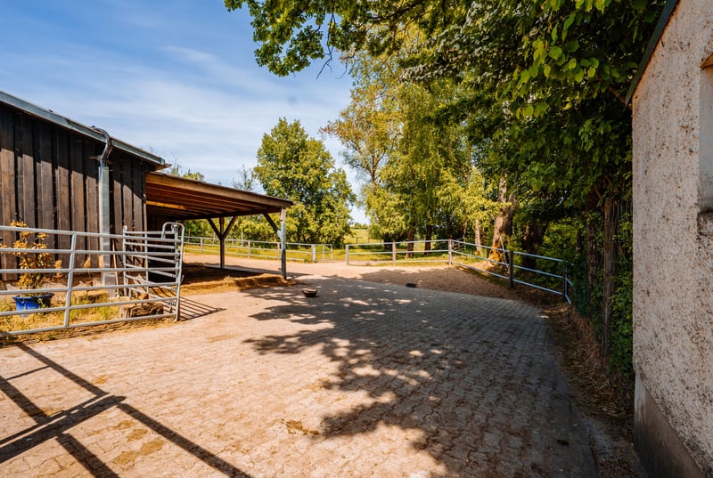Nur ca. 15 Fahrminuten von Regensburg entfernt in der Gemeinde Sinzing befindet sich THE RANCH – ein außergewöhnlicher Reiterhof auf über 8 Hektar. Hier verbinden sich: • professionelle Pferdehaltung • durchdachte Infrastruktur • nachhaltige Bewirtschaftung • exklusives Wohnen zu einem Gesamtanwesen, das in dieser Form nur selten am Markt verfügbar ist. Bereits bei der Ankunft wird deutlich, dass es sich hier nicht um eine gewöhnliche Immobilie handelt. Die gesamte Anlage ist klar strukturiert, hochwertig ausgeführt und auf effiziente Abläufe ausgelegt – ideal für alle, die Pferdehaltung sowohl mit Leidenschaft als auch wirtschaftlich betreiben möchten. Die Reitanlage – professionell, vielseitig und sofort nutzbar Auf rund 8 Hektar entfaltet sich eine Reitanlage, die in dieser Form selten zu finden ist. Im Zentrum steht die moderne Reithalle (25 × 50 m, Baujahr 2013), die ganzjährig optimale Trainingsbedingungen bietet. Aktuell auf Westernreiten ausgelegt, lässt sich die Anlage mit geringem Aufwand flexibel auf andere Disziplinen wie Dressur, Springen oder Vielseitigkeit umstellen. Ein besonderes Highlight ist das direkt integrierte Reitstüberl das als Treffpunkt für Reiter und Gäste dient und eine einzigartige Atmosphäre schafft. Der Zuschauerbalkon ermöglicht dabei einen perfekten Blick auf das Geschehen – ideal für Kurse, Veranstaltungen oder Turniere. Ergänzt wird die Reitanlage durch einen großzügigen Außenreitplatz (28,5 × 90 m), der sowohl für anspruchsvolles Training als auch für Turniere geeignet ist. Die Stallanlage ist vollständig ausgebaut und bietet Platz für ca. 30 Pferde. Sie überzeugt durch ihre durchdachte Struktur und flexible Nutzungsmöglichkeiten: Insgesamt stehen 14 Innenboxen, davon 3 Abfohlboxen mit Kameraüberwachung, 9 Paddockboxen sowie 2 Offenställe (1 davon mit direktem Koppelzugang) zur Verfügung. Ergänzt wird die Anlage durch 7 große Sandpaddocks im Außenbereich sowie überdachte Paddockbereiche. Großzügige, direkt angrenzende Koppelflächen bieten optimale Bedingungen für Haltung, Training und Zucht. Ein weiterer wesentlicher Aspekt ist das durchdachte Sicherheitskonzept der Anlage. Das gesamte Anwesen ist über eine Schrankenanlage mit Nummernschilderkennung organisiert, wodurch der Zugang gezielt gesteuert werden kann. Ergänzend dazu sind zentrale Bereiche wie Reithalle, Hof und Stallungen videoüberwacht. Dieses System sorgt nicht nur für ein hohes Maß an Sicherheit, sondern schafft auch Vertrauen – sowohl für Betreiber als auch für Einsteller und Kunden. Effizienz & Struktur – wirtschaftlich und zukunftssicher Die gesamte Anlage ist kompakt und logisch aufgebaut, wodurch kurze Wege und klare Abläufe den täglichen Betrieb erheblich erleichtern. Dadurch lässt sich der Hof mit vergleichsweise geringem Personalaufwand effizient führen – ein entscheidender wirtschaftlicher Vorteil. Zusätzlich überzeugt THE RANCH durch ein nachhaltiges Energiekonzept: Eigene Wiesen dienen der Heugewinnung, während der angrenzende Wald Hackschnitzel für die Wärmeversorgung liefert. Eine Holz-Pelletheizung, Photovoltaikanlage, Wärmepumpe für den Pool sowie eine separate Wärmepumpe für die Pferdedusche sorgen für einen weitgehend autarken und kosteneffizienten Betrieb. Die Warmwasseraufbereitung erfolgt ergänzend über Öl. Das Wohnhaus – Großzügigkeit, Atmosphäre und maximale Flexibilität Direkt am Innenhof gelegen, mit Blick auf die gesamte Anlage und dennoch vollkommen privat, präsentiert sich das Wohnhaus als stilvoller Rückzugsort. Das im Jahr 2011 umfassend generalsanierte Gebäude (Ursprungsbau 1980er Jahre) vereint heute ländlichen Charme mit modernem Wohnkomfort und hochwertiger Ausführung. Auf ca. 319 m² Wohn- und Nutzfläche erstreckt sich ein großzügiges Raumkonzept, das aktuell als eine Einheit genutzt wird, sich jedoch problemlos in zwei separate Wohneinheiten mit eigenen Eingängen aufteilen lässt. Bereits der Eingangsbereich führt in einen lichtdurchfluteten Küchen- und Essbereich mit direktem Zugang zur Terrasse und zum Pool. Große Fensterflächen schaffen eine offene, einladende Atmosphäre – ein zentraler Ort für gemeinsames Leben und gesellige Momente. Ein Gäste-WC sowie der direkte Zugang zur Garage und Waschküche sorgen für eine besonders praktische Alltagsstruktur, insbesondere im Zusammenspiel mit dem Hofbetrieb. Das Herzstück des Hauses bildet der beeindruckende Wohnbereich mit offenem Dachstuhl, sichtbaren Holzbalken und großzügigen Raumhöhen. Große Dachfenster durchfluten den Raum mit Licht, während der Kamin eine warme, gemütliche Atmosphäre schafft. Zwei Zugänge zur Terrasse verbinden Innen- und Außenbereich auf harmonische Weise. Über eine elegante Treppe im Landhausstil gelangt man auf die offene Galerie, die nicht nur einen eindrucksvollen Blick in den Wohnraum bietet, sondern auch zusätzliche Nutzungsmöglichkeiten eröffnet. Von hier aus erschließt sich ein weiterer Wohnbereich, der als eigenständige Einheit genutzt werden kann – mit Büro, separater Küche, Balkon, zwei Schlafzimmern sowie einem großzügigen Badezimmer. Ein zusätzliches Gästezimmer mit eigenem Bad ergänzt diesen Bereich ideal. Ein separat zugängliches Appartement mit eigenem Bad und Küchenzeile bietet maximale Flexibilität – ob als Mitarbeiterwohnung, Gästebereich oder zur Vermietung. Das Haus verfügt über insgesamt 6 Garagenplätze sowie zusätzliche Stellflächen im Innenhof, wodurch ausreichend Platz für Fahrzeuge, Pferdeanhänger und Equipment vorhanden ist. Wellness & Lebensqualität – ein Ort zum Ankommen Auch der Außenbereich unterstreicht den besonderen Charakter dieses Anwesens. Die großzügige Terrasse lädt zu entspannten Sommerabenden ein, während der ganzjährig nutzbare Pool mit Schiebedach, die Sauna und der Whirlpool für ein Höchstmaß an Komfort sorgen. Ein Poolhaus ergänzt das Ensemble und macht den Gartenbereich zu einer e