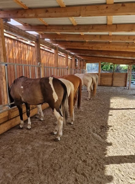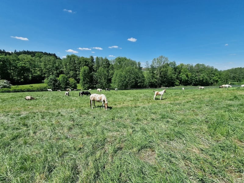 We have available spaces in a large open stable, which will be expanded later this year with a paddock trail. Additionally, a 20 x 40 meter riding arena is being built, and a 15 x 30 meter indoor riding hall is available. A large, covered outdoor riding area will be complemented by another one along the trail. Hay or straw is available 24/7, ensuring there is always something to nibble on. A 160-liter automatic water trough that refills itself is accessible around the clock and can also be reached directly from the paddock. The horses have access to 4.7 hectares of pasture, directly reachable from the stable. A tack room, a lounge, and a toilet are on-site. There is a wonderful riding terrain nearby for hacking. We are just starting this stable, so everyone has the opportunity to contribute their ideas and be involved from the beginning. The horses are cared for comprehensively, and we are on-site. We are happy to assist with horse training or minor issues. Feeding is done individually via feed racks, allowing us to cater to specific needs. Unfortunately, stallions are not permitted. Horses taller than 1.60 m should be discussed individually. A beautiful riding terrain is available. A tack room is on-site. If you enjoy taking turns on stall duty, you can of course save on the price. Well-behaved dogs are very welcome! Currently, a paddock box for a large horse or two smaller horses is available. Location: 84419 Obertaufkirchen.