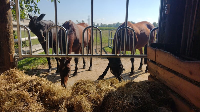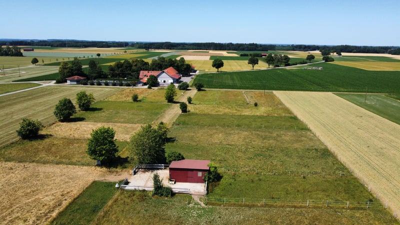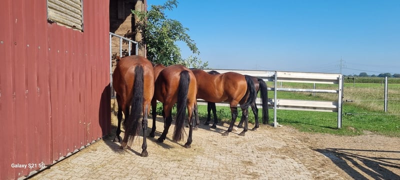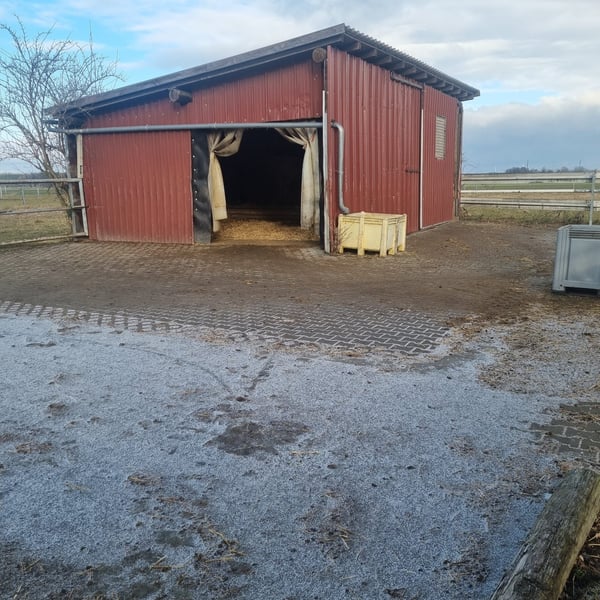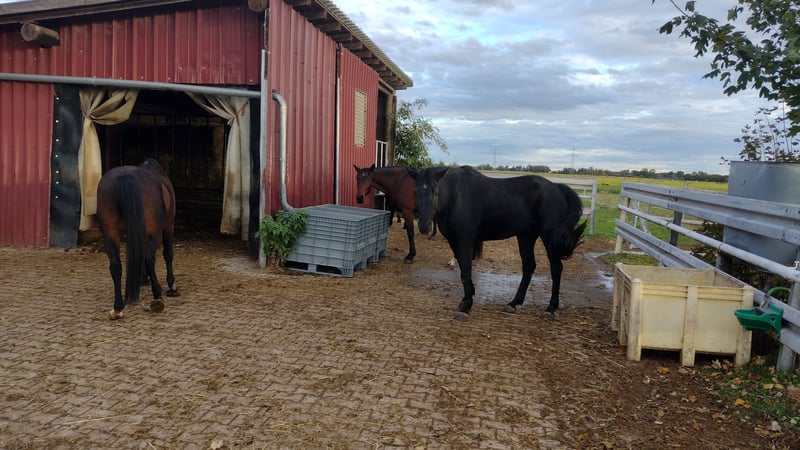 Offenstall: - Wallachherde (max. 5 Pferde) - 50m² Offenstall mit Gummimatten und Stroh - 235 m² befestigtes Paddock - 100m² befestigte Koppel - mehrere gepflegte Grünflächen / Koppeln - mehrere Fresstellen mit zwei Zugängen - Brunnen- und Regenwasser Allgemein: - Kleine Stallgemeinschaft - Reitplatz (Teppichschnipsel) mit Flutlicht - Longierhalle (Sand/Flies) - Führanlage (Teppichschnipsel) - Sattelkammer - Futterkammer - Stellplätze für Pferdeanhänger - Waschplatz - Solarium - Schönes Ausreitgelände