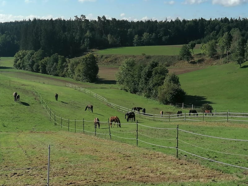Wir bieten eine großzügige und gepflegte Pferdeanlage in ruhiger, idyllischer Lage in Schönbronn bei Wört mit einem umfangreichen Leistungsangebot. Unsere Pferde werden in Vollpension betreut – Füttern, Misten und täglicher Weidegang sind inklusive. Heu, Stroh und Hafer stammen aus eigenem Betrieb und sind im Preis enthalten. Mineralfutter, spezielles Kraftfutter etc. werden vom Besitzer gestellt. Innenboxen • Große Einzelboxen • Besonders geeignet für Rentnerpferde, Zuchtstuten, Sportpferde • Heuraufen für staubarme Futteraufnahme und Tränkebecken • Bei geeigneter Witterung täglicher Weidegang. • In der nassen Jahreszeit: befestigter Paddockplatz pro Box Paddockboxen • Große Boxen mit direktem Zugang zum eigenen Paddock • Heuraufen für staubarme Futteraufnahme und Tränkebecken • Waagrecht geteilte Paddocktüren • Optionaler Windschutzvorhang zur Vermeidung von Zugluft • Weidegang bei geeigneter Witterung Gruppenboxen mit Paddockzugang Sehr großzügige Boxen mit über 20 m2 mit direktem Paddockzugang • Ideal für Fohlen- Jungpferdeaufzucht, Pony- oder Isländergruppen sowie für 2-3 gut harmonisierende Pferde • Waagrecht geteilte Paddocktüren • Optionaler Windschutzvorhang • Wahlweise Tiefstreubox mit Häckselstroh für eine besonders weiche Liegefläche • Weidegang bei geeigneter Witterung Optional: Pacht eines Stalltrakts • Mehrere Boxen zu rabattierter Miete • Ideal für den Einstieg in die Selbstständigkeit • Mitgestaltungsmöglichkeiten, Mitentscheidungen, Futterdienste u. v. m. • Wir sind offen für Ihre individuellen Vorstellungen Ausstattung der Anlage • Großzügige Stallgasse • Pferdewaschplatz • Untersuchungsstand für Stuten • Heu, Stroh, und Häckselstroh aus eigener Produktion in Top-Qualität • Weitläufige Koppeln mit über 2 Hektar Fläche direkt am Stall • Reitplatz mit hochwertigem, nahezu ganzjährig nutzbarem Boden inkl. Flutlichtanlage und Hindernissen • Reithalle ca. 1 km entfernt, bequem über Feldwege erreichbar • Wunderschönes, ruhiges Ausreitgelände direkt ab Stall Angebote für die Besitzer • Waschraum mit Spülmaschine und Waschmaschine • Toilette • Beheiztes Reiterstübchen • Sattelkammer