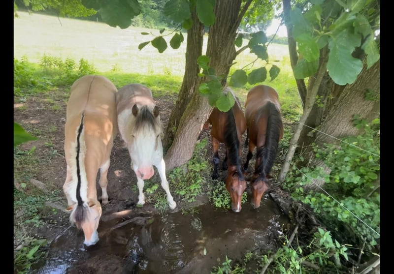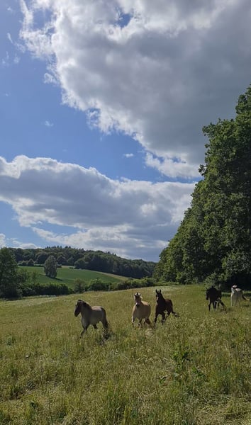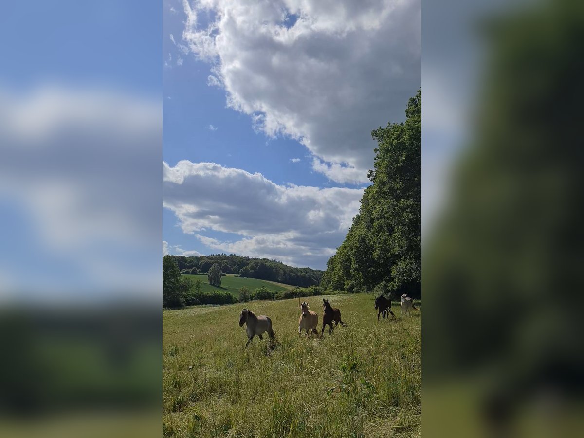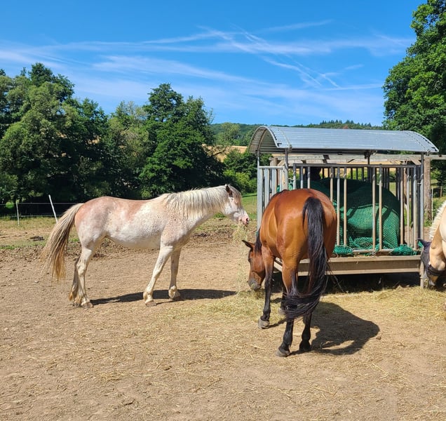 Wir bieten für den Sommer (ca. Mitte Juni bis Oktober) einen Weideplatz für ein Pferd auf einer ruhigen Wiese an. Die Fläche wird zunächst gemäht und zur Heugewinnung genutzt. Erst danach kommen die Pferde darauf. Dadurch steht nur kurzes Gras zur Verfügung. Zusätzlich gibt es 24/h Heu im engmaschigen Heunetz. Die Wiese eignet sich daher besonders gut für leichtfuttrige Pferde oder Pferde, die nicht viel Gras vertragen. Auf der Wiese befindet sich ein Unterstand aus Holz mit Dach, mehrere Schattige Plätze mit Bäumen, sowie eine kleine Hütte, in der man die wichtigsten Sachen lagern kann. Ein Bachlauf ist mit eingezäunt und dient – je nach Wasserstand – als natürliche Wasserquelle. Sollte er trocken sein, steht ein Wasserfass zur Verfügung. Aktuell stehen zwei Wallache und eine Stute auf der Fläche, es handelt sich um eine ruhige, kleine Gruppe. Gesucht wird ein unkompliziertes, robustes und leichtfuttriges Pferd, das wenig Futterbedarf hat. Sehr schönes Ausreitgelände ist direkt erreichbar. Optional besteht gegen Aufpreis die Möglichkeit, eine nahegelegene Reitanlage (Reitplatz und Reithalle, ca. 10 Minuten zu Fuß) mitzunutzen. Bei Interesse gerne melden.