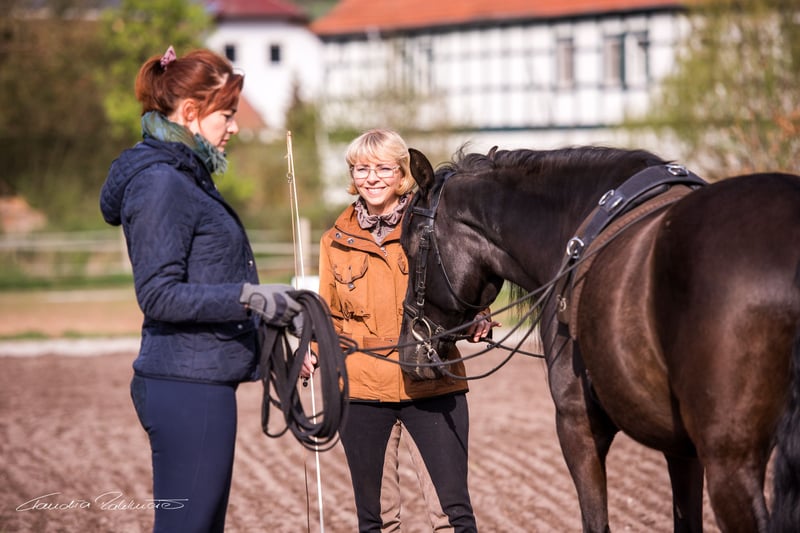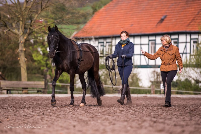 Drei-Tage-Paket "Doppellonge kennen lernen" Ein Wochenende für die harmonische Kommunikation zwischen Reiter und Pferd an der Doppellonge. Unsere Schulpferde sind darauf spezialisiert, mit ihren Longenschülern Missverständnisse aus dem Weg zu räumen. Viele sind völlig verblüfft, wie logisch doch alles sein kann! Mit unseren Barock-Schulpferden wird es dem Doppellongen-Neuling natürlich ganz besonders einfach gemacht. In unserer Gestütsführung zeigen wir Ihnen die Pferde der Reinen spanischen Rasse, die Deckhengste, Stuten mit Fohlen, Jung- und Schulpferde vom Gut Drebsdorf. Beim ersten Kennenlernen mit Putzen, Satteln, Trensen wird Sie der menschenbezogene Charakter unserer Schulpferde bereits begeistern. 1. Trainingseinheit: Wir erstellen mit Ihnen eine genaue Analyse Ihrer Kenntnisse und holen Sie bei Ihrem Wissensstand ab. Erklären die Ausrüstungen und Grundlagen. Erste Übungen mit persönlichem Trainer. Nur Sie, das Pferd und der Trainer in einer Reithalle. Keine Zuschauer. 2. Trainingseinheit: Die zweite Einzelreitstunde gestalten wir ganz nach Ihren Kenntnissen und bauen auf der ersten Einheit auf. Gerne erklären wir Ihnen auch, wie Sie die ersten Schritte bei Ihrem unerfahrenen Pferd zuhause gehen. Oder Sie erhalten für zuhause praktische Hinweise zur Verbesserung aller Hilfen. 3. Trainingseinheit: In der letzten Stunde vertiefen wir die Hilfengebung und erarbeiten vielleicht schon die ersten Seitengänge je nach Ihren Vorkenntnissen. Leistungen: 2x Übernachtung in der Ferienwohnung 3x Einzel-Trainingseinheit mit Theorieanteil 1x Gestütsführung Preis für eine Person 419,- EUR, Begleitperson ohne Reiten bezahlt nur 45,- EUR Preis für zwei Personen mit Unterricht pro Person 302,- EUR. Nicht buchbar an/um Feiertage. Nach Verfügbarkeit jederzeit verlängerbar !