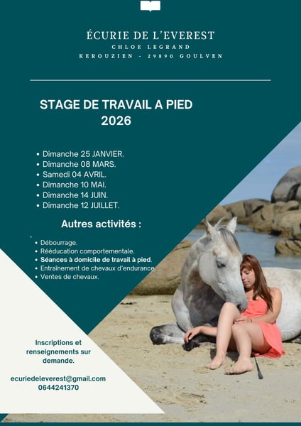Planning 2026 : Muni d'un diplôme en iet science équine je propose des places pour des séances à domicile : • Éducation du poulain / jeune cheval. • Gestion des émotions du cheval. • Travail sur les respect. • Améliorer la relation. • Travail en liberté. • Travail sur les figures (couché, pas espagnol...). Rééducation comportemental : • Cheval qui ne se laisse pas attraper au champs. • Peur de la tondeuse. • Rétif en extérieur. • Cheval qui arrache la longe • Et bien d'autres problèmatiques. Les inscriptions aux stages sont ouvertes. D'autres créneaux sont possible pour des stages dans votre écurie.