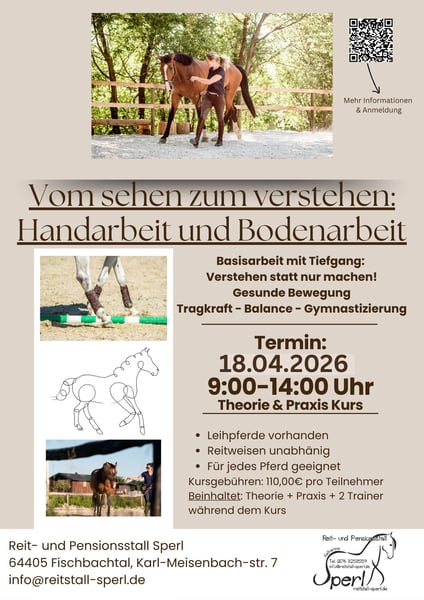Termin: 18.04.2026 9:00-14:00 Uhr Buchungen und Zeitliche Abläufe über das Reitbuch: https://reitstall-sperl.reitbuch.com/course.php?c=77 oder das untenstehende Kontaktformular Vom Sehen zum Verstehen: Handarbeit & Bodenarbeit Dieser Kurs verbindet fundiertes Wissen mit direkter Umsetzung und zeigt, wie Hand- und Bodenarbeit zu einem wertvollen Bestandteil des Trainingsalltags werden kann – für ein gesundes, tragfähiges und geschmeidiges Reitpferd. Gemeinsam in der Gruppe sammeln wir zu Beginn gezielt Themen, Fragen und Problemstellungen rund um Handarbeit und Bodenarbeit. Die Inhalte entstehen somit nicht nach einem starren Plan, sondern orientieren sich an den Bedürfnissen der Teilnehmenden und ihrer Pferde. Aus diesen Themen entwickeln wir sinnvolle Übungen, die gezielt gymnastizieren, Kraft aufbauen und die Balance des Pferdes verbessern – als wichtige Grundlage für Tragfähigkeit und Vorbereitung auf Versammlung. Im anschließenden Theorieteil werden die großen Zusammenhänge verständlich erklärt: Welche Wirkung haben die einzelnen Übungen auf den Pferdekörper? Welche Muskelgruppen werden gestärkt? Wie unterstützen Grundlektionen an der Hand die langfristige Gesunderhaltung? Und wie lassen sich Bewegungsabläufe korrekt erkennen und beurteilen? Zwei Trainer begleiten die Veranstaltung parallel: Ein Trainer demonstriert die jeweilige Übung praktisch am Pferd, während der zweite Trainer zeitgleich erklärt, was im Körper des Pferdes passiert, woran man gesunde Bewegung erkennt und wie sich eine korrekte Ausführung beurteilen lässt. Ein besonderer Schwerpunkt liegt auf dem Verstehen von Problemen und Lösungswegen. Nicht jedes Pferd kann eine Übung sofort korrekt umsetzen. Wir besprechen typische Fehlerbilder, erklären mögliche Ursachen und zeigen, wie der Weg zur korrekten Ausführung aussehen kann – pferdegerecht, nachvollziehbar und individuell. Im Anschluss wird die Gruppe geteilt. Jede Gruppe erhält 1,5 Stunden intensive Praxis, um die erarbeiteten Inhalte unter Anleitung umzusetzen, zu festigen und auf das eigene Pferd anzupassen. Der Kurs zeigt außerdem, wie sich regelmäßige, kurze Grundlektionen an der Hand leicht und sinnvoll in den Alltag integrieren lassen – oft wertvoller als lange Trainingseinheiten. Richtig eingesetzt fördern sie die Gesunderhaltung, verbessern die Tragfähigkeit, machen das Pferd geschmeidiger für das Reiten und können Rittigkeitsprobleme verringern. Diese Veranstaltung ist abwechslungsreich, praxisnah und lehrreich – für alle, die lernen möchten, gesunde Bewegung zu erkennen, Zusammenhänge zu verstehen und ihr Pferd nachhaltig zu fördern.