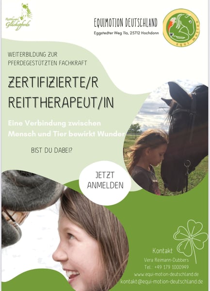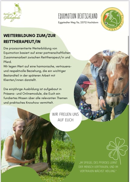 Die praxisorientierte Weiterbildung zur Fachkraft für pferdegestützte Intervention / ReittherapeutIN / ReitpädagogIN von Equimotion basiert auf einer kooperativen Zusammenarbeit zwischen Reittherapeut/in und Pferd. Dabei wird großer Wert auf eine harmonische, vertrauensvolle und respektvolle Beziehung gelegt, die eine fundamentale Voraussetzung für die zukünftige Arbeit mit Klienten/innen darstellt. Warum Equi-Motion? Erfahren Sie mehr über unsere einzigartigen Ausbildungsangebote und Konzepte: - Intensives Training mit erfahrenen Dozenten - Flexibles Lernen mit Online- und Präsenzmodulen - Engagement für die Entwicklung von Fähigkeiten und Kompetenzen Equi-Motion ist in der Zertifizierungsphase der ISAAT und des Berufsverbands PI. Dadurch erfüllen wir internationale Standards und erhalten die Qualität einer fachgerechten Ausbildung. Infoabend Online: 5.11.3025 1. Kursstart: 26.11.2025 2. Kursstart: 21.1.2026 Erfahre mehr auf unserer Homepage Equi-Motion-Deutschland.de