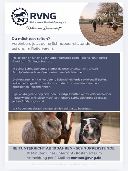 Du möchtest reiten? Vereinbare jetzt deine Schnupperreitstunde bei uns im Reiterverein. Melde dich an für eine Schnupperreitstunde beim Reiterverein Neuried - Gauting in Gauting - Hausen. In deiner Schnupperstunde lernst du unseren Unterricht, unsere Schulpferde und das Vereinsleben persönlich kennen. Dich erwarten ein kleiner Verein, liebe Schulpferde sowie qualifizierter, individuell abgestimmter Unterricht durch unsere erfahrenen und engagierten Reitlehrerinnen. Egal ob du gerade beginnst, bereits fortgeschritten reitest oder nach einer Pause wieder einsteigen möchtest - unsere Schnupperstunde passt zu jedem Erfahrungsstand. Wir freuen uns darauf, dich persönlich bei uns zu begrüßen. Foto, Nicola Friedrich REITUNTERRICHT AB 10 JAHREN - SCHNUPPERSTUNDE 30 Minuten Einzelunterricht • Kosten 40 Euro Anmeldung per E-Mail an contact@rvng.de
