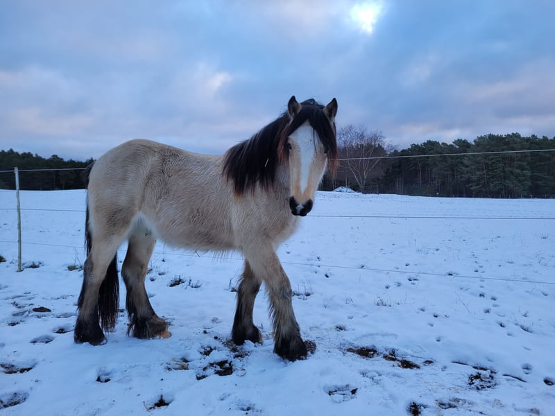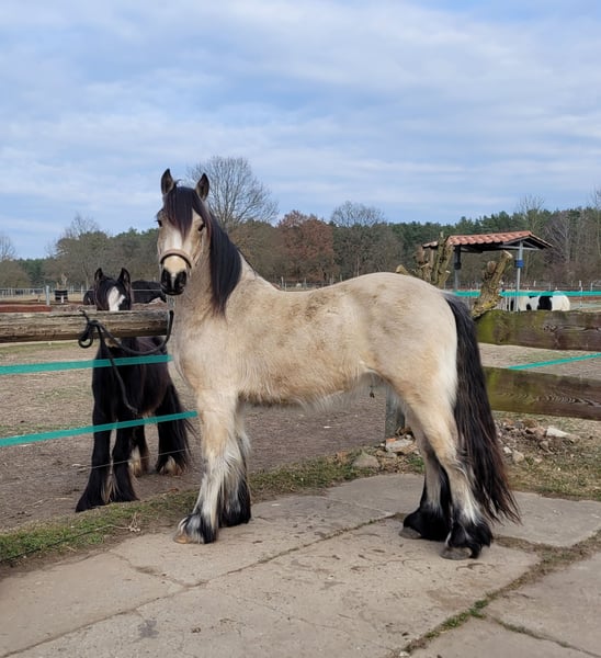Direkt vom Züchter! 3jähriger Tinker Wallach in Sonderfarbe buckskin, Falbe, Gelbfalbe, Goldfalbe. Justus ist in seiner Familien-Herde aufgewachsen und hatte nur besten Umgang. Er ist schmiedefromm, verladefromm und kennt bereits Bodenarbeit. Auch läuft er bereits ohne Last vor der Kutsche mit. Noch ist er hinten überbaut und im Wachstum. Da Tinker Spätentwickler sind, sollte er erst 4jährig geritten werden. Vor der Kutsche kann er jetzt schon arbeiten und Muskeln aufbauen. Irish Cobs sind keine Gewichtsträger. Zu 25% ist er Altmärker Kaltblut. Ausgwachsen sollte er 70 Kilo tragen können. Um ihn zu reiten bin ich aus gesundheitlichen Gründen leider in den letzten 2 Jahren zu schwer geworden. Ich wünsche ihm einen Mensch, der ihn liebt und zu schätzen weiß. So ein Pferd wie ihn habe ich mir immer gewünscht und er hat bisher viel Aufmerksamkeit bekommen und fordert diese auch.