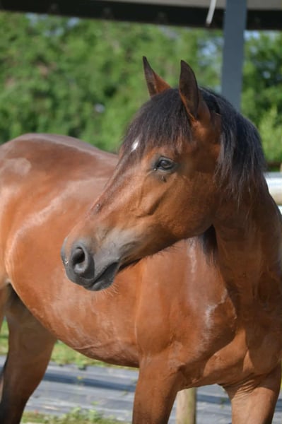 By Arlequin de Mormal x Nikita de Cissai Loreau is a respectful and exceptionally gentle pony. He has an excellent temperament and is very people-oriented. Easy to care for and handle, he will be an ideal partner. He has competed in his first shows and demonstrates a great jumping ability, a calm mindset, and excellent honesty: he will always come back to you after the obstacle. Very versatile, he will delight you across all disciplines. He has already done cross-country, mountain trail, and enjoys hacking alone or with company. He is familiar with life in the paddock, both in a herd and in a box. Currently shod in the front, he is up to date on vaccinations, and has been seen by the farrier, osteopath, and dentist.