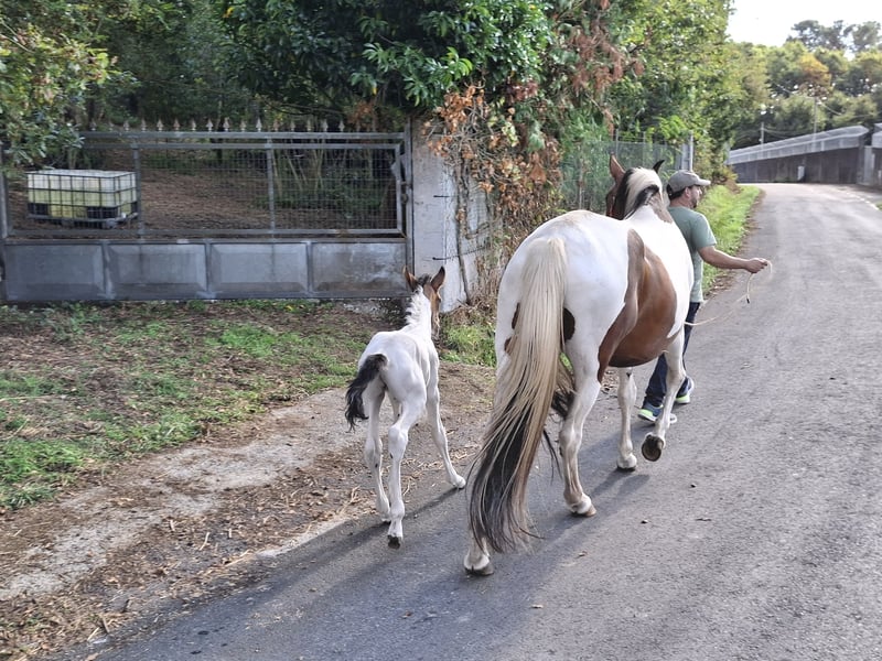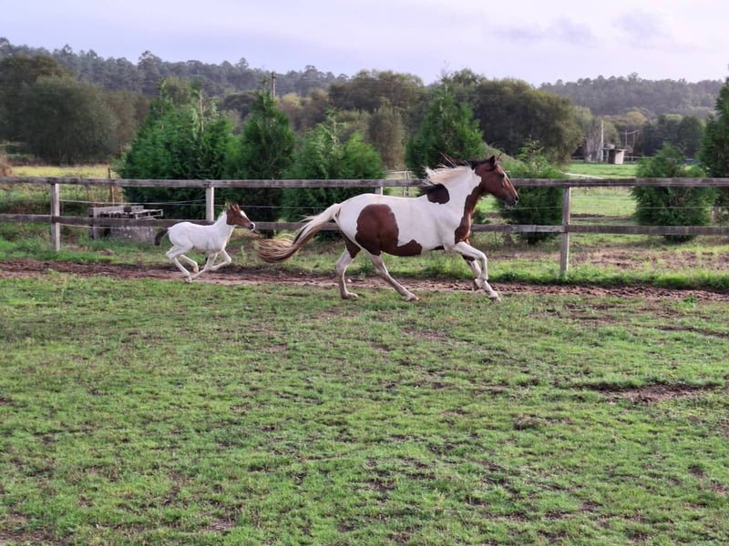 Verkauft wird eine wundervolle Stute mit Pía-Farbe, eingeritten, mit außergewöhnlichem Charakter. Kreuzung aus spanischem und lusitanischem Blut. Zudem steht ein neugeborener Fohlen mit Pía-Farbe zum Verkauf. Es handelt sich um besondere Exemplare, Fotos des Vaters mit Pía-Farbe und Perlmutt-Schimmer sind vorhanden.