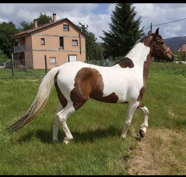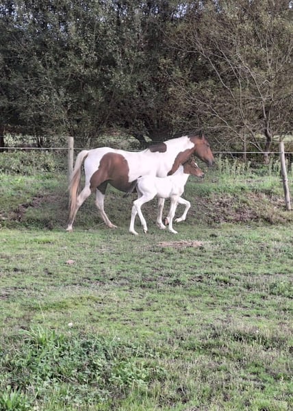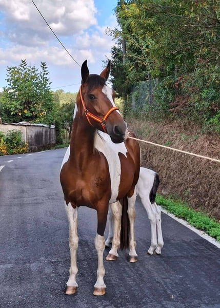 Se vende maravillosa yegua de capa pía montada caracter fabuloso cruzada de español con lusitano con potro de capa pio recien nacido ejemplares especiales de capa fotos del padre de capa pio perla