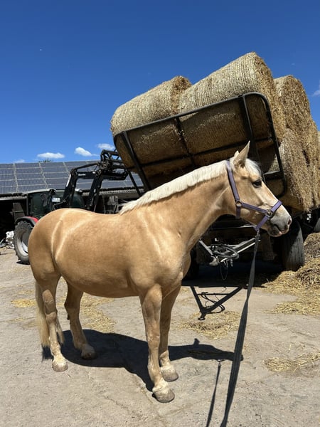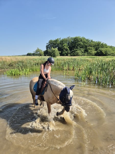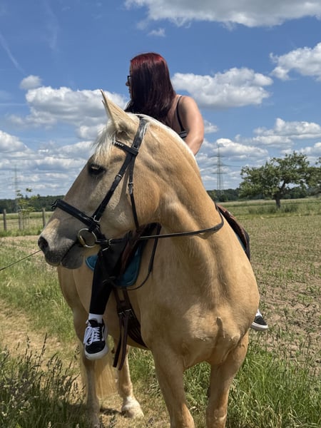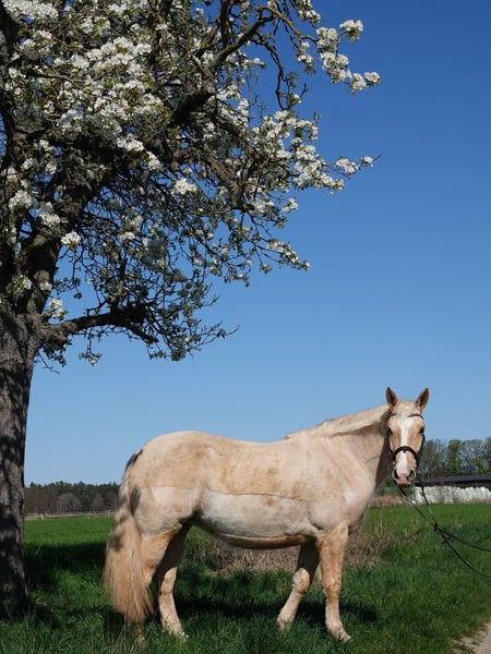 I am offering my 7-year-old (*July 10, 2018, in Spain) Cruzado mare (Lusitano x Merenzen), Dorada (nickname: Luana), in the color Pearl, for sale. She is being sold for personal reasons and this is not a distressed sale, so she will only go to a five-star home. General information about her: Luana has an approximate height of 15.5 hh and covers that range very well. She has a Spanish passport and came to Germany at around 2.5 years old, eventually finding her way to me. She is vaccinated against herpes and tetanus, and at the vet she is very straightforward and well-behaved. Luana is shod in front and also easygoing with the farrier. She is currently in a mare herd turnout. She is quite dominant but always fair and generally friendly towards other horses. I have also kept her in a box, which was no problem. Luana loads without any issues. She is also regularly dewormed. The small health check-up (AKU) two years ago, when I bought her, was clear. Aside from that, she has no known health problems (except that she is still a bit chubby). About her temperament: Luana has a curious and very friendly nature. She is very attentive to humans but needs time to fully trust her rider, so she usually bonds with one or two main handlers. Once trust is established, she gives her best and truly blossoms. She loves ground work, handwork, and lunging and works with great enthusiasm. She learns quickly from the ground as well as under saddle. She walks, trots, and canters in the arena. Most of the time, she is quite relaxed and needs a consistent rider to motivate her to move forward. Luana loves hacking out. When ridden alone, she is a very reliable partner (traffic-safe). In a group, she can sometimes be a bit energetic. She generally has no bad habits when ridden, such as bucking or rearing. She also loves to bathe and is always up for fun and playfulness. - Since she is still young and at the beginning of her training, I am looking for someone with experience, preferably also with young horse training, who can continue where we left off. I see her as the perfect leisure partner. She would also be suitable as a family horse, as she loves children. *Please note: These details are based on my perception.* She can be sold with full tack for an additional fee. I do not want her to go to a dealer or riding school!!! Videos available upon request. If you are genuinely interested, please send me a message or give me a call. Luana is looking forward to meeting you!