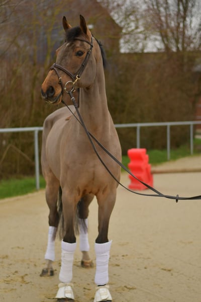 **Vic, Our Beautiful Dressage Horse** Discover our exceptional dressage horse – a true gem with *three outstanding elastic gaits*! With an excellent walk and a lively, expressive trot, this horse offers impressive movement potential, which is one of his greatest strengths. We care for this lovely fellow daily with joy and passion. He possesses a lot of quality and has a good heart. Unfortunately, he has not been optimally trained recently and now requires the right riding approach to fully realize his potential. During his time with us, we are working intensively on developing his abilities. As a young horse, he has already participated in several competitions and shows great talent. Whether you are looking for a reliable partner for entering the competition arena or for ambitious leisure riding, this horse is exactly what you need! **Special Offer:** Immediate purchase comes with a 5% discount on the sale price! **Test Opportunity:** Take the chance to test this horse with us for one week. This trial week can be accompanied by talented trainers, and you have the option to combine it with riding lessons. Please note that a trial fee applies, which is not deducted from the purchase price. **Pre-Ride/Trial Ride:** You are welcome to come and see our treasure in person. The cost for a pre-ride or trial ride is €30 per person. Don’t miss this opportunity! Our wonderful dressage horse is seeking a nurturing hand and is eager for new challenges. Visit us and see for yourself!