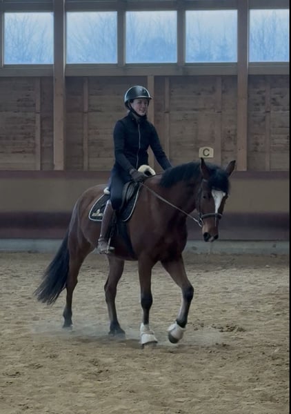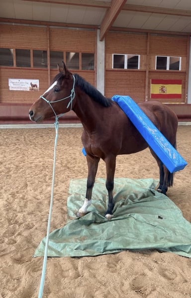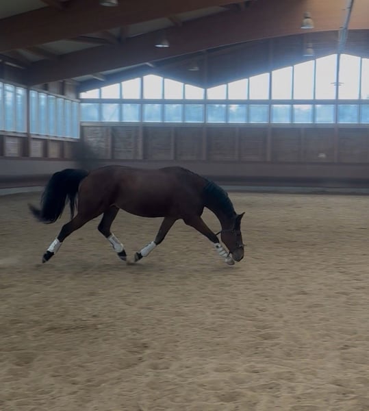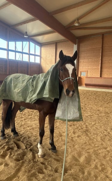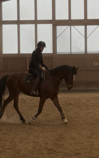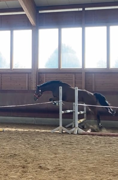 "Bobby Brown" is a 5-year-old, 15.3 hh gelding. Over the past few months, I have been riding him, and he shows motivation and attentiveness under saddle. Currently, he is ridden in walk, trot, and canter in the indoor arena and is beginning to jump small fences with the rider. However, this needs to be consolidated and further developed — a solid foundation is already in place. In terms of character, Bobby is an absolutely sweet and friendly fellow. He also impresses with his excellent basic gaits, in which he responds well to aids. At present, he is not suitable for beginners, as he is still in training and requires confident, consistent, and calm aids. Please inquire only if you have sufficient experience. What he already knows: - Calmness exercises with stuffed animals, tarps, and dual reins: he performs these relaxed and composed - Obedient lunging - Exposure to dogs, chickens, tractors as part of his daily routine - Short walks outside - Free jumping, initial pole work, and small jumps - Basic contact and some lateral work such as shoulder-in and bending Bobby grew up in a large herd on extensive pastures. He is currently housed in a box with a paddock and spends his days either playing with his gelding friends (four in total) or outside with my other mare. He has the best prerequisites to become a wonderful riding or even sport horse with patience and loving encouragement. Ideal for someone who enjoys training young horses and is looking for a friendly, unspoiled horse that is still in the early stages but shows potential and willingness to work. A recent, clear end-of-year health check (AKU) from late July is available. He can stay in training for further development. The price will increase with additional training.
