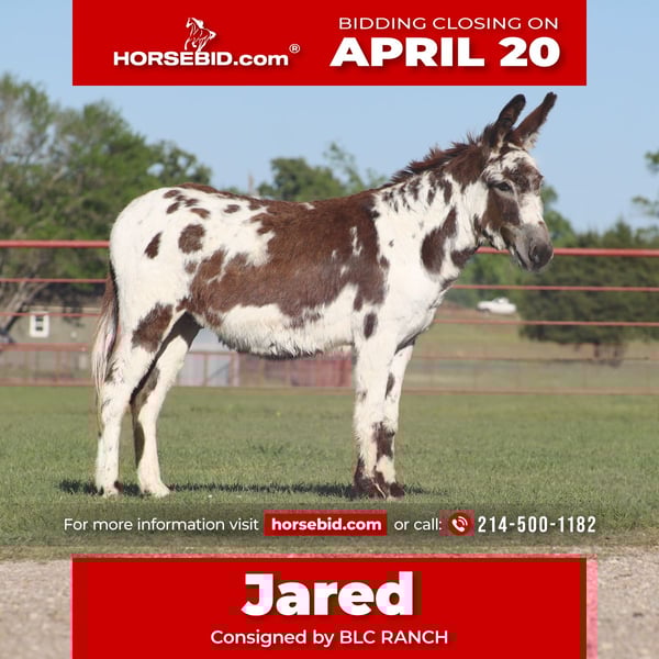 ⚜️𝐭𝐡𝐞 𝓔𝓵𝓲𝓽𝓮 𝐒𝐩𝐫𝐢𝐧𝐠 𝐂𝐥𝐚𝐬𝐬𝐢𝐜⚜️ Happening now thru MONDAY | APRIL 20th - Available EXCLUSIVELY on HorseBid's website! For more details and to register visit: www.Horsebid.com CONSIGNOR CONTACT: BLC RANCH Brett Clark 214-500-1182 LOCATION: Grand Saline, TX BREED: Donkey REGISTERED: No REGISTERED NAME: Jared COLOR: Black and white HEIGHT: 46 inches AGE: 5 GENDER: Gelding Everyone meet Jared!! He’s 46 inches tall and painted like a picture. J is a 5 year old gelding. A definite farm favorite around here. He always comes to greet you and is a people person. Very unique markings and an awesome disposition. He is so chill and is like having a good buddy to hang out with!! Jared has been rode lead line. He bathes and loads in the trailer with ease. J has spent countless hours just hanging out around the hitchin post with horses and people. He’s seen dogs and the commotion of wild kids. Overall he is just a cool individual with a good attitude. Jared sells sound and sane. Please call 214-500-1182 with any further questions