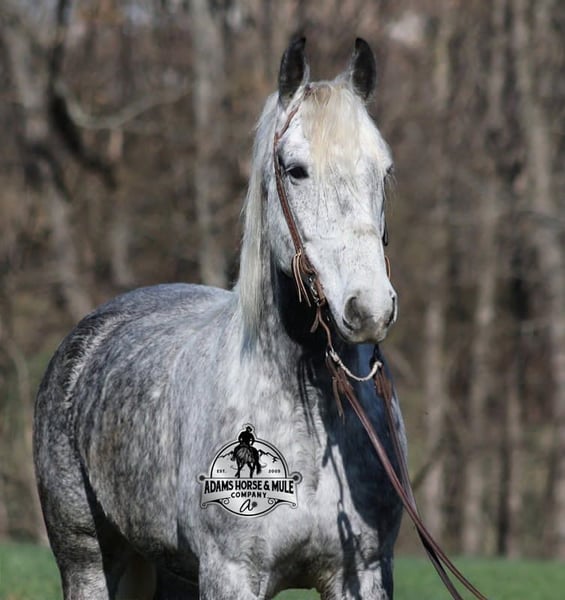 ▪️▫️◾️𝐭𝐡𝐞 𝑴𝒂𝒚 𝐒𝐞𝐥𝐞𝐜𝐭◾️▫️▪️ Happening now thru MONDAY | MAY 4th - Available EXCLUSIVELY on HorseBid's website! For more details and to register visit: www.Horsebid.com CONSIGNOR CONTACT: Adams Horse and Mule Company 606-308-2461 LOCATION: Mt. Vernon, KY BREED: Draft Cross REGISTERED: REGISTERED NAME: All Smoked Out COLOR: HEIGHT: 15.2 AGE: 10 GENDER: Gelding All Smoked Out has Dapples the size of apples! Just try to count the dapples on this guy! Smokey is a stout built draftcross gelding standing around 15.2hh, he will weigh 1250lbs, he is 10 years old, and he is that super pretty dapple grey coloring with a silver mane and tail! He is one cool looking guy! Not only does he look cool, he is has all of the other boxes checked as well… he is Mr. Personality, as friendly as they come, loves attention and is very calm natured. Smokey is out of the same breeding program as several other top draftcross geldings that we have had over the last 4 years and every one of them has the right mind with the calm nature that makes them great family horses. Smokey has been in our program since last year and has completed the natural horsemanship training and does liberty work and he also knows some tricks, he will bow, lay down and set on his rump. Smokey is great on trails and he will cross creeks, ditches, logs and navigate rough rocky areas. He has a smooth jog, a VERY VERY nice easy to set lope, a good stop, turns a circle both ways and backs with ease! He has been exposed to all kinds of wildlife such as deer or turkey or other animals like cows or dogs and will go anywhere that he is asked too. He has been rode many miles in the mountains of Eastern Kentucky and encountered every obstacle possible on the trail. He will go up or down even the steepest slopes, across deep creeks, over downed trees, and over all types of rough terrain while still being sure footed. Smokey is not cinchy, cold backed, does not crib or weave. In addition to riding, Smokey has also been driven down the highways as well. Smokey is a super cool horse that anyone is sure to love!!! Feel free to call Eric 606-308-2461 with any questions.