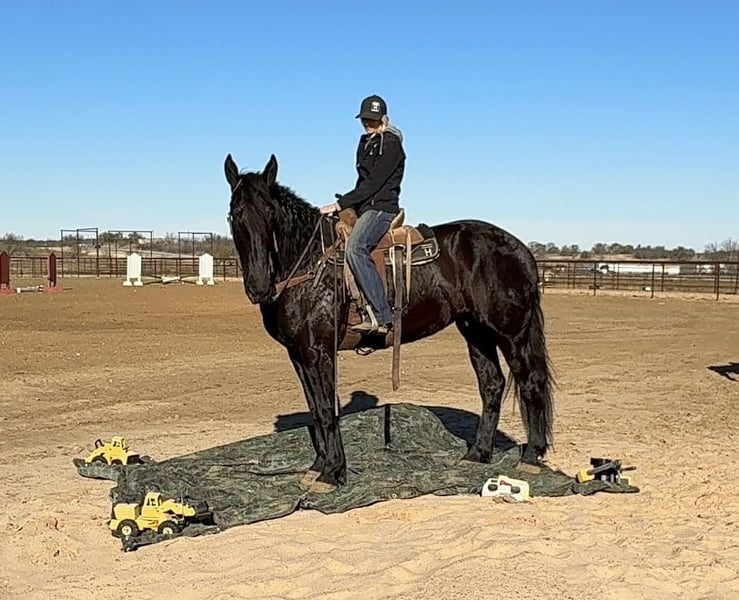 VENTE EN LIGNE Placez vos enchères sur www.PlatinumEquineAuction.com Offre de départ : 3 500 $ La vente se termine le 28 décembre 2025 Vous cherchez une nouvelle selle ? Découvrez White Rock Saddles sur notre site internet ou Facebook. Smoke est un grand, gentil et calme hongre Percheron de près de 4 ans, mesurant 17,1 mains. C’est un cheval très volontaire et doux, avec énormément de potentiel. Smoke est entraîné à la conduite en solo et en paire, commencé en équipement anglais, et parfait pour les randonnées. En carrière, il est bien avancé dans les deux disciplines, avec d’excellentes transitions. Il a été initié aux obstacles au sol et aux petits cross-rails. Il est souple, facile à monter, et apprend très rapidement. En extérieur, Smoke possède une mentalité de vétéran, confiant et prêt à aller partout où vous le guidez. Il peut mener ou suivre, à la vitesse que vous souhaitez. Au sol, Smoke est doux et amical. Facile à attraper, il aime l’attention. Il est entraîné à la conduite en solo et en paire. Il est monté à cheval par son demi-frère, Coal, également disponible si vous souhaitez les acquérir en duo. Smoke est sain, droit, et doté de jambes propres. À jour de tous ses vaccinations, il est facile pour le maréchal-ferrant, cohabite bien avec les autres ou peut être mis en box seul comme un gentleman. Pour plus d’informations, contactez ou envoyez un SMS à Chanel de Holland Horse Company au 559-978-6320. Situé à Jacksboro, Texas.
