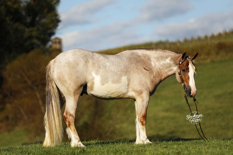 Waylon a 2021 model, 15.2-hand red roan Gypsy Draft cross Gelding