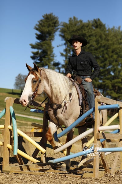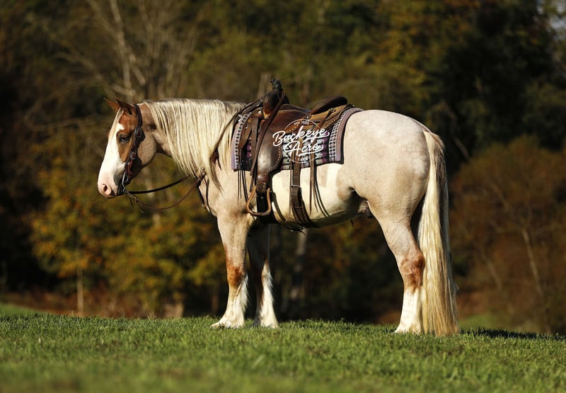 Waylon — wow, what a truly unique and eye-catching gelding we have to offer. He is a 2021 model, 15.2-hand red roan Gypsy Draft cross with a wide white blaze, four white socks, and a splash of white on his side that makes him stand out everywhere he goes. His color, shape, and kind expression make him one you will fall in love with the moment you see him. Waylon has been one of our trainer Nate’s personal horses for the past year, and it truly shows in his training and personality. He has been on countless trail rides, including moonlight rides, and always takes everything in stride and with charm. He is sure-footed and confident going up and down hills, over logs, and through creeks and water crossings. He loves trail rides, whether he is going out alone or with other horses and enjoys every minute of it. In the arena, Waylon knows his leads, has smooth, easy gaits, and side passes right up to the mounting block to make it easy for you to get on. He has been ridden western, English, and bareback, and he also drives, making him a truly versatile family horse. From the grandkids to the advanced rider, he is the kind of horse everyone can enjoy and feel safe on. Waylon is a gentleman to be around in the barn. He stands quietly for the farrier, in the wash bay, and for grooming — and he absolutely loves attention. The more love and care you give him, the more he gives back. He enjoys being part of the daily routine and is just as happy to greet you at the gate as he is going for a ride. He is well desensitized to tarps, jugs, gunshots, and whips. You can ride him once a day or once a week, and he stays the same solid and dependable partner. He has been turned out with other horses and gets along great with everyone. Waylon is traffic safe and has been on state roads, through town, and in parades, both ridden and hitched to a carriage. Waylon is truly one of those once-in-a-lifetime kind of horses — a beautiful, gentle, and dependable gelding with all the looks, training, and personality you could ask for. Whether you are looking for a trail partner, a family horse, or a trustworthy all-around gelding, Waylon will make you smile every time you see him. If this sounds like the horse that you have been looking for, please feel free to reach out to Duane @ 330-231-2324 for more information or to Schedule a day to stop by and see him in person.