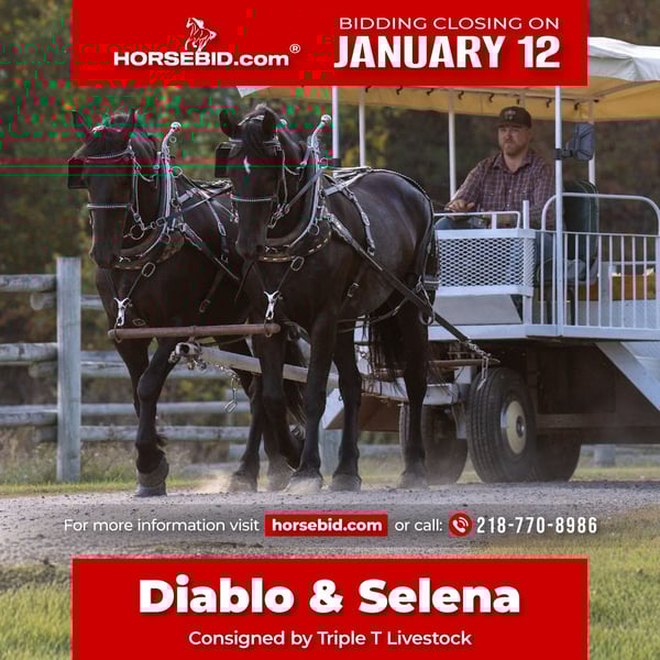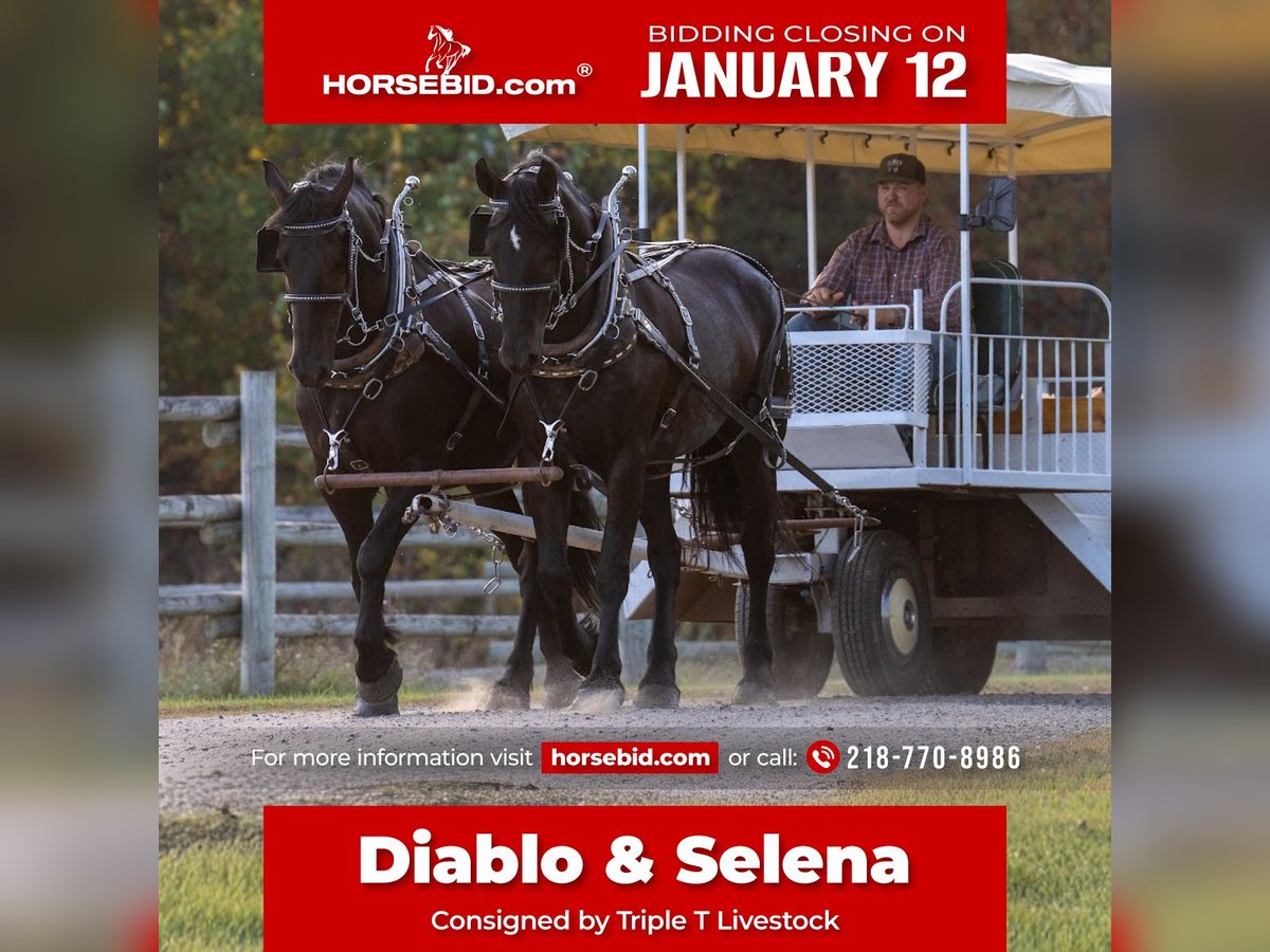 ♦️𝐍𝐄𝐖 𝐘𝐄𝐀𝐑'𝐒 𝑬𝒙𝒕𝒓𝒂𝒗𝒂𝒈𝒂𝒏𝒛𝒂♦️ Happening now thru MONDAY | JANUARY 12th - Available EXCLUSIVELY on HorseBid's website! For more details and to register visit: www.Horsebid.com CONSIGNOR CONTACT: Triple T Livestock 218-770-8986 LOCATION: Nevis, MN BREED: Draft Cross REGISTERED: No REGISTERED NAME: Diablo & Selena COLOR: Black HEIGHT: 16.2 AGE: 0 GENDER: Gelding & Mare Diablo & Selena are an exceptional full brother-and-sister team that are as impressive in size as they are in ability. Standing a striking 16.2 hands, this young pair combines eye-catching presence with a calm, willing attitude that is hard to find. Selena, a 5-year-old mare, and Diablo, a 6-year-old gelding, are broke to drive the very best. They have been hooked to all types of machinery and have extensive experience driving up town on busy streets, making them confident, traffic-safe, and reliable in real-world situations. Nothing seems to bother them, and they handle new environments with ease. We have used them for weddings, funerals, and holiday sleigh rides. They are super fun and hassle free to drive. Both horses have excellent dispositions and are easy to handle on the ground and in harness. They stand quietly, hitch and unhitch smoothly, and work together naturally as a team. Their matching size, breeding, and training make them a standout pair for pleasure driving, farm work, parades, or anyone looking for a dependable, classy driving team. Diablo and Selena are the kind of young, well-started team that is ready to go in any direction and will continue to get better with time — a rare opportunity to own a matched sibling pair with this much quality and experience.