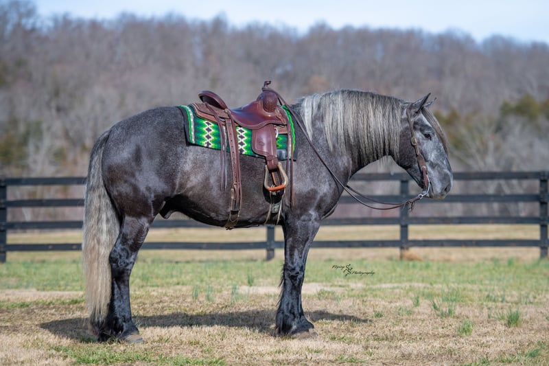 ▪️▫️◾️𝐭𝐡𝐞 𝑴𝒂𝒚 𝐒𝐞𝐥𝐞𝐜𝐭◾️▫️▪️ Happening now thru MONDAY | MAY 4th - Available EXCLUSIVELY on HorseBid's website! For more details and to register visit: www.Horsebid.com CONSIGNOR CONTACT: Edwin Raber 319-283-0616 LOCATION: Fairbank, IA BREED: Percheron x Quarter Horse (Draft Cross) REGISTERED: No COLOR: Gray HEIGHT: 16.2 AGE: 5 GENDER: Gelding Keystone is the definition of a gentle giant, and is the perfect gentleman whether his rider is big or small. He is a 5-year-old draft cross gelding that stands a solid 16.2h, weighing in at 1500 lbs, and wearing a #6 draft shoe. By a Percheron stallion and out of a Quarter Horse mare. He is honest and genuine in his ride, taking care of an inexperienced or a young rider as they stroll down the trails. Keystone is a jack of all trades; he rides Western, English, bareback, bridleless, and even drives! You can expect him to be a seasoned trail or arena mount, even with time off, he picks things up right where you left off. He is a pleasure to be around on the ground, under saddle, or under harness. Keystone will go wherever he is pointed down the trails, where he easily crosses downed timber, walks quietly through the rivers, and handles rugged terrain with ease. He is accustomed to all wildlife as well, whether he comes across a flying pheasant in Iowa, or a speedy road runner in Arkansas; Keystone has seen it all! Whether you are out on the trails or in the arena, he stands patiently at a mounting block or will even stand next to a rock or log to be mounted. He is truly a horse that an entire family can enjoy and is so versatile. He has a personality that everyone loves, as he enjoys all of the attention. He is personable with everyone and doesn't know a stranger. You will notice in his photos and video that he has a true double mane, falling thick and even on both sides of his neck! He is truly one of a kind. Keystone has put up with a lot from me as you will see in the video, always keeping a level head and the utmost patience. He stands quietly with side-by-sides doing donuts around him and even entertains attention from a 7.5ft T-Rex on the ground and under saddle. He handles new things like a seasoned pro, and it's one of our favorite things about him. Keystone picks up his leads correctly on cue, lopes beautiful circles in a field or in the arena. He does everything that is asked of him without hesitation. Even with new riders on his back, he is always aiming to please. For a crossbred gelding, there isn't much that Keystone hasn't done, or hasn't been exposed to. He is extremely well rounded and versatile, making him a great fit for so many riders and families. All of our video was taken while on vacation in Arkansas, a brand-new place to him. Though it is not in the video, we want to emphasize how well he drives and how well he handles riding through the busy streets of our small town. Keystone is traffic safe and handles a busy environment very well. He is not a stranger to trail obstacles; and enjoys all of the horseplay with the tarps, balls, and anything else the kids can think of. Keystone loads and hauls very well, he is a gentleman for the farrier and the veterinarian, bathes well, and stands quietly to be groomed and tacked up. He is used to being around farm equipment and all types of farm animals from small pets to poultry. He is easy to catch and happy whether he is stalled or turned out and gets along well with others in a pasture setting. Radiographs or a pre-purchase exam can be arranged (at buyers' expense). If you have any questions or would like to meet Keystone prior to the auction ending, please CALL Edwin at 319-283-0616.